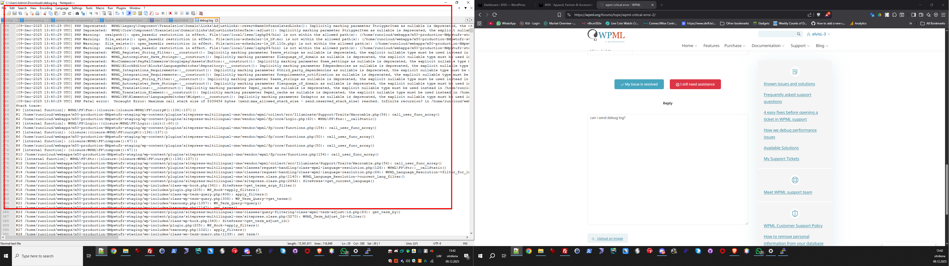 Problem: The client reported a critical error on their site, experiencing a PHP 8.3 infinite recursion issue leading to a 503 error. This was traced back to a potential bug in the WPML plugin with the newer WordPress version. Solution: 1. We asked the client to check if the issue persists after following the steps described on the erratum page for PHP 8.3.x errors, which can be found here: PHP 8.3.x Fatal Error. 2. We requested a detailed description of the issue, including steps to reproduce it and any error messages, to better understand the problem. 3. We asked for access credentials to the site to investigate the configuration and reproduce the issue. 4. We inquired if the client would prefer to continue troubleshooting the issue or remain on the older WordPress version (v6.8.9) that did not exhibit the problem.