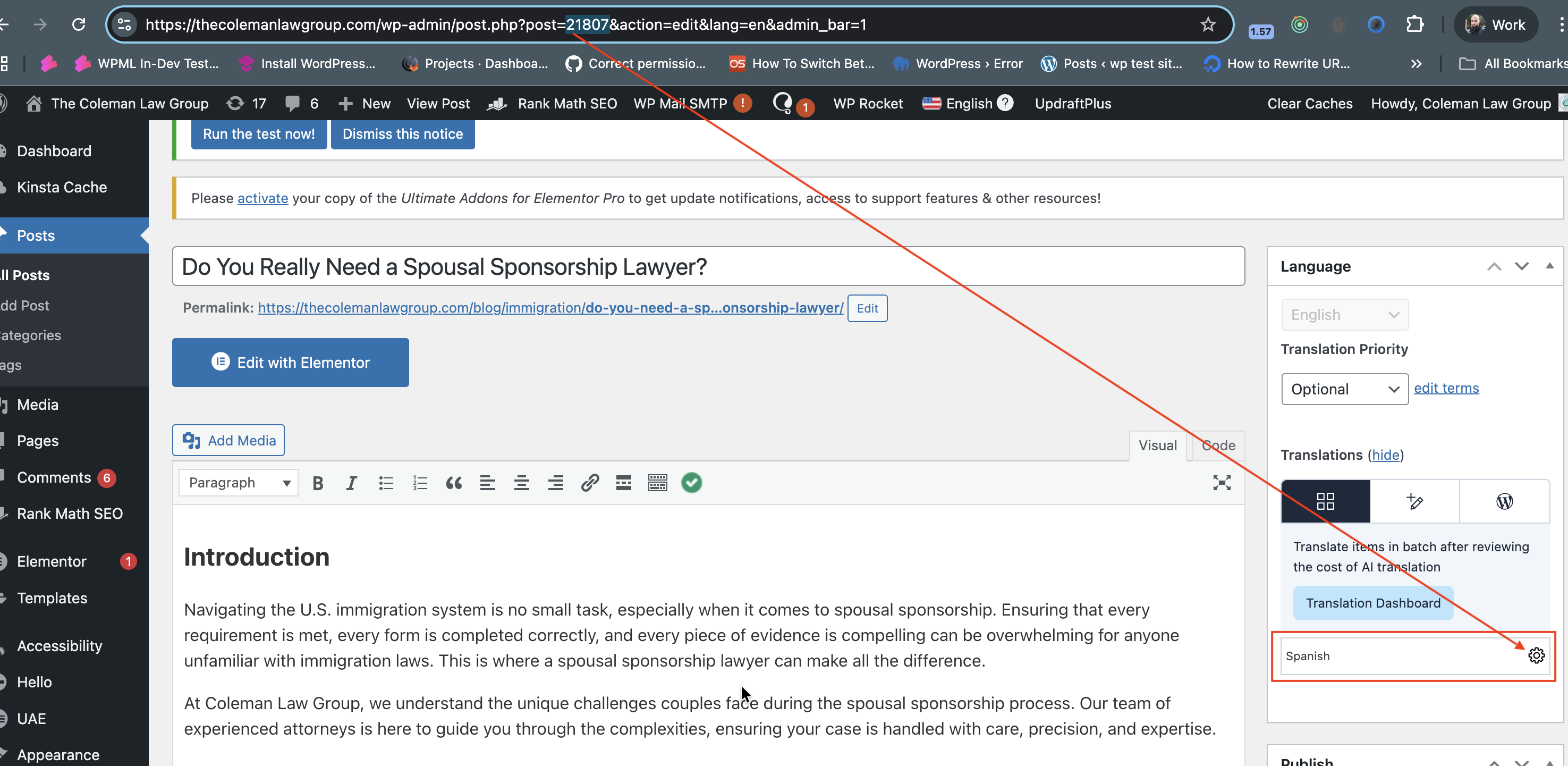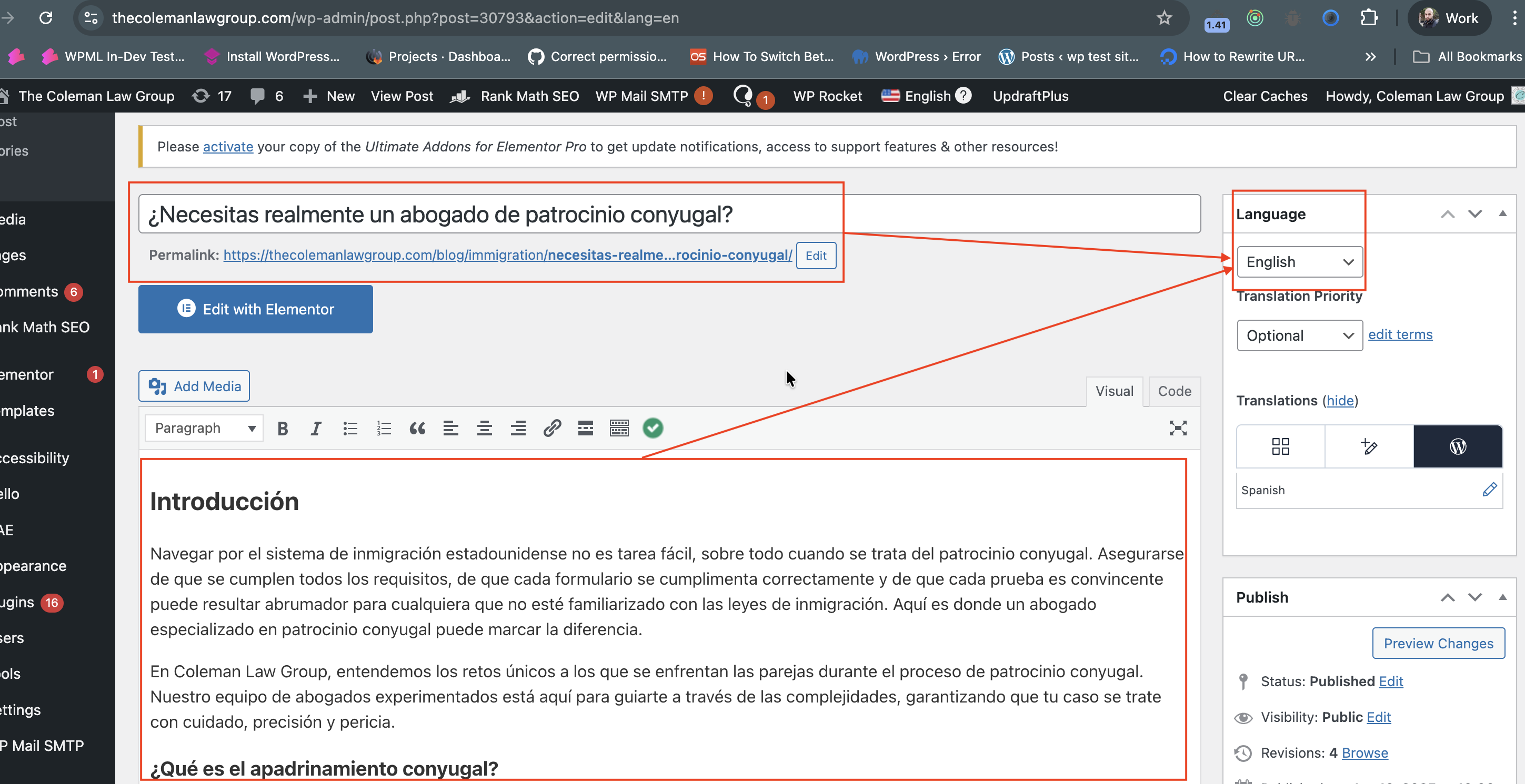 The URL hidden link is for a Spanish post which is a translation of an orignal English post (ID 21807) (URL: hidden link) As far as I see it looks correct -- Just keep in mind that the Spanish translation seems to be still not completed yet (See screenshot "Spanish translated needs completion.png")