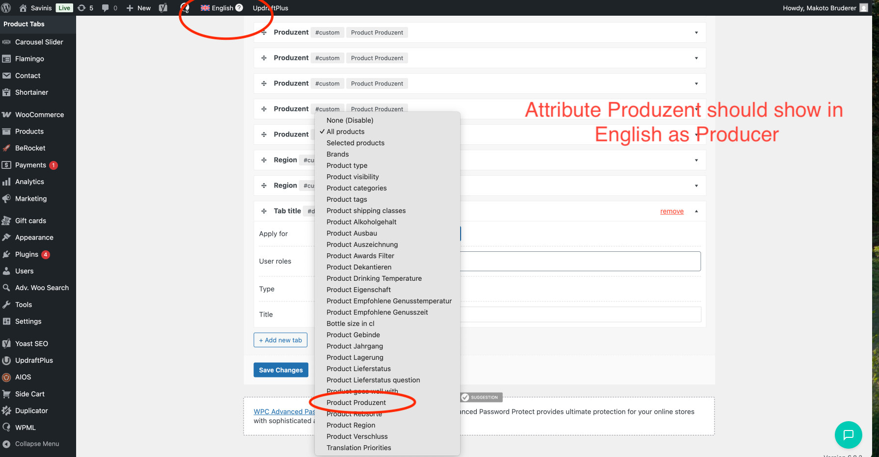 When I create tabs for German, they also appear in English and French, but I cannot translate the content. The dropdown of attributes do not show in different languages, and any content added in different admin languages appears on product pages for all languages.