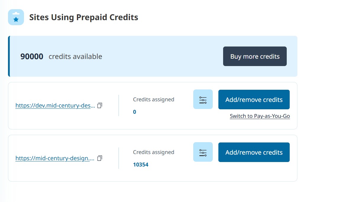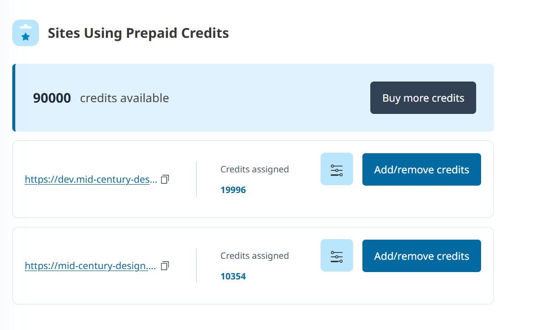 Purchase packages of prepaid credits and assign them to your site