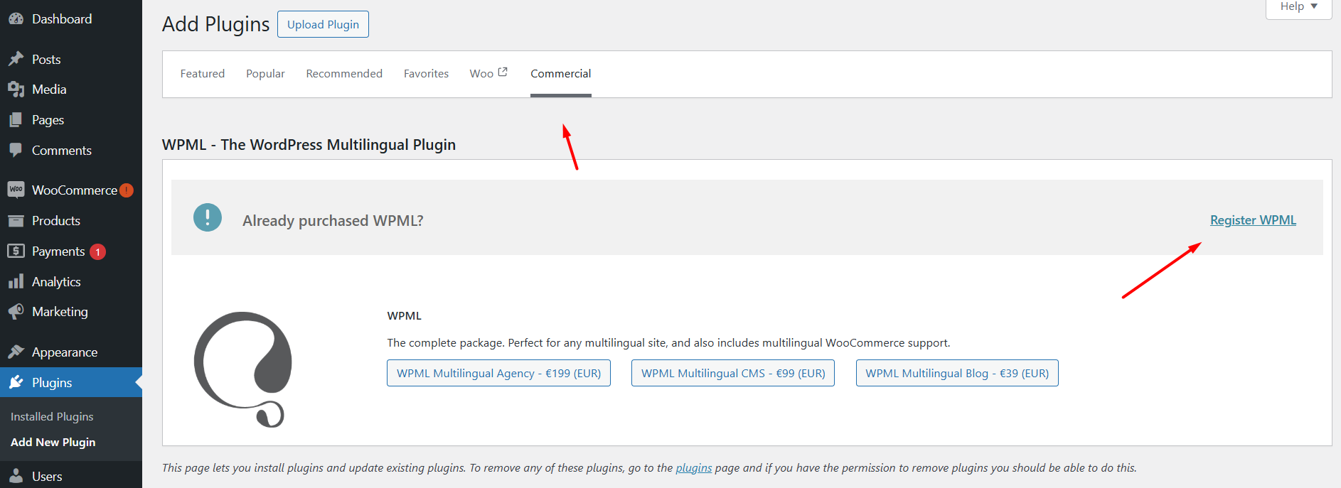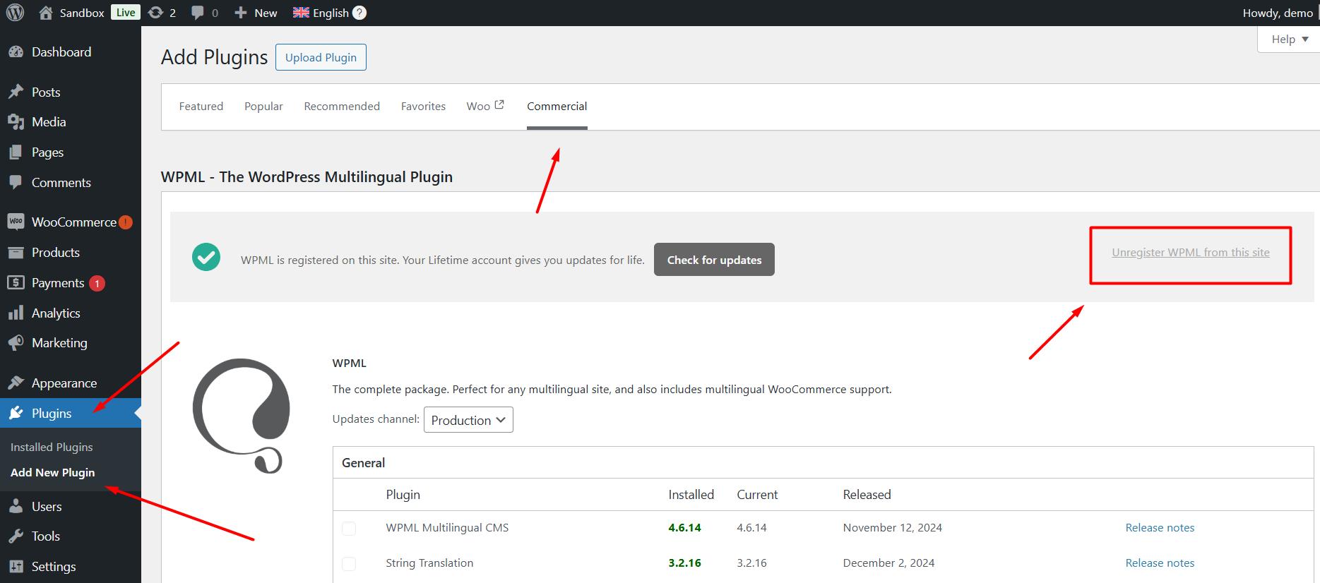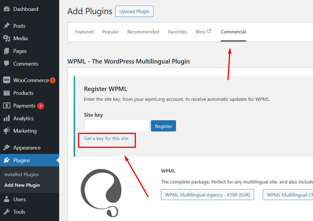 **Unregister WPML on your site**: Go to your WordPress admin and navigate to **Plugins → Add New → Commercial** tab. Locate WPML and click the **Unregister** link to deregister your current site key.