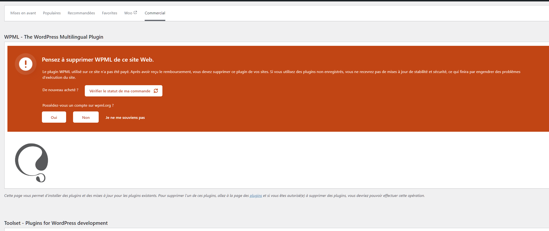Si vous avez déjà un compte, vous pouvez essayer de connecter le site à votre nouveau compte en cliquant sur "OUI, j'ai déjà un compte". Assurez-vous de faire un backup complet de votre site et de votre base de données avant de continuer. Si le problème persiste après cette étape, nous vous recommandons de créer un nouveau compte administrateur temporaire pour notre équipe et de nous fournir les accès via un champ privé que nous avons activé pour votre sécurité. Ne partagez pas votre propre compte admin. Une fois que vous avez configuré l'accès, essayez de naviguer vers "Extensions > Ajouter > Commercial (onglet)" et cliquez sur "Inscrire WPML" pour enregistrer votre nouvelle clé.