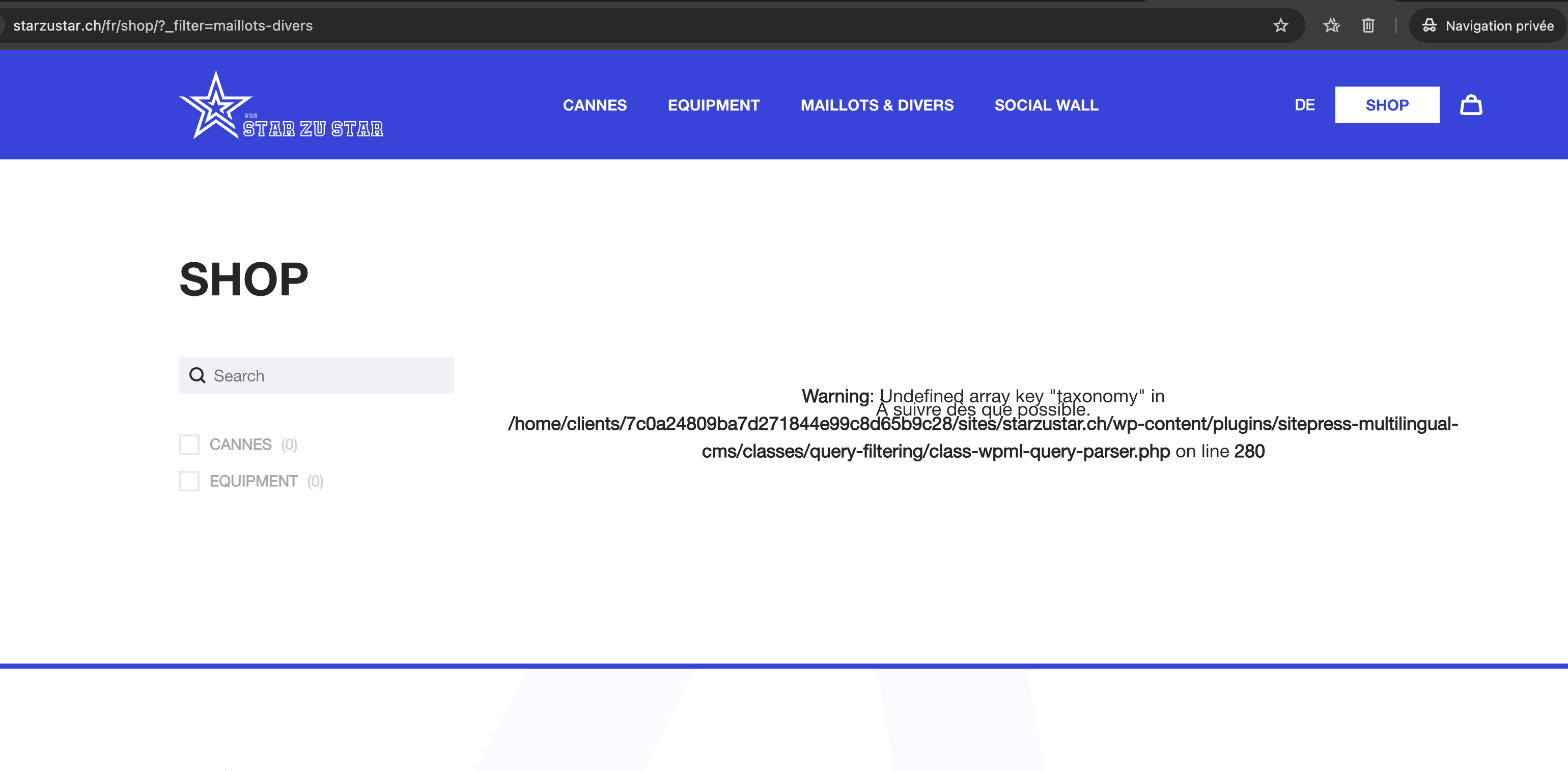 Vous rencontrez un avertissement PHP indiquant une clé de tableau non définie "taxonomy" lors de l'affichage des produits en français sur votre site.