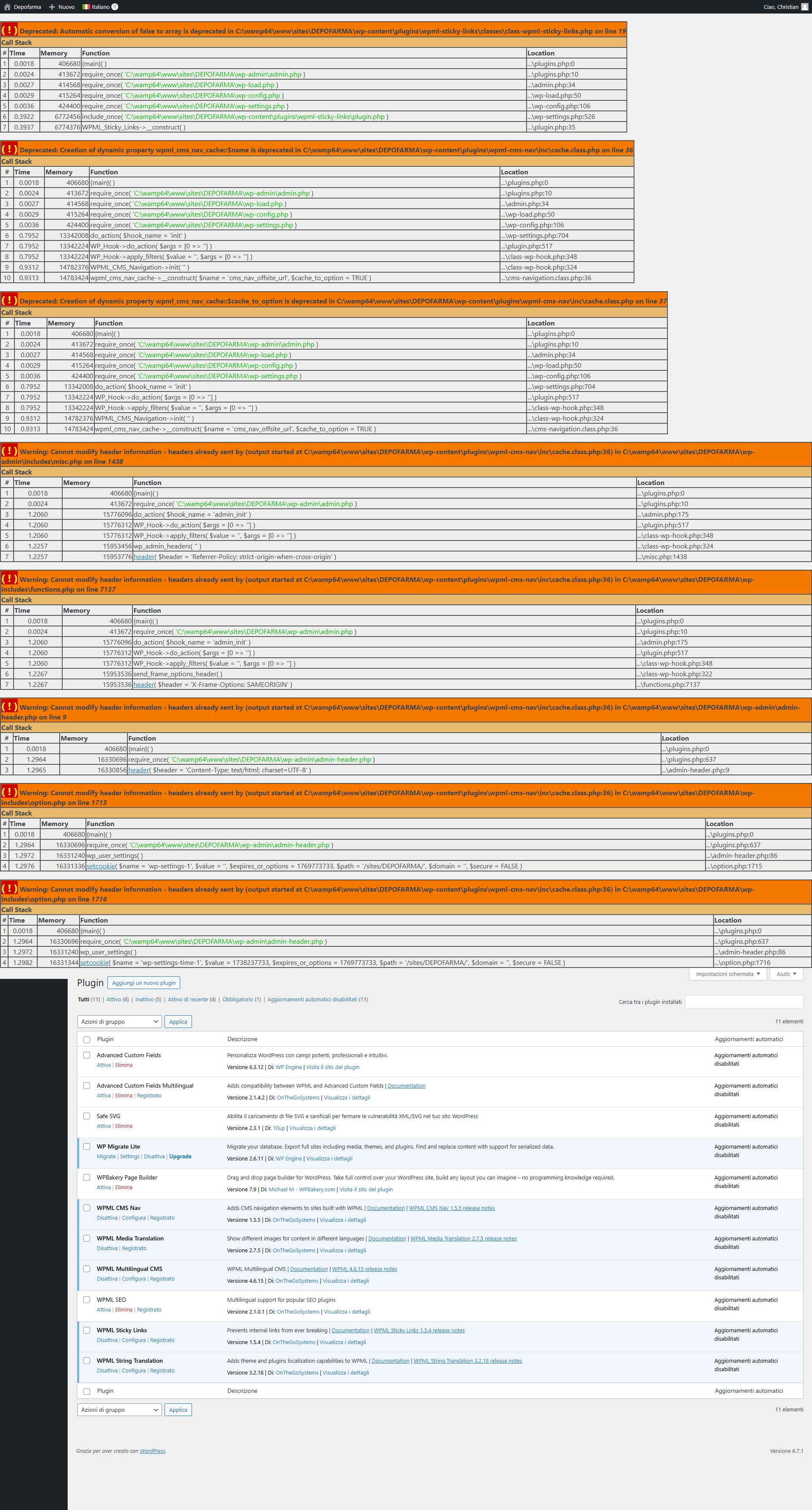 Ottengo 3 messaggi di Deprecated: 'Deprecated: Automatic conversion of false to array is deprecated in /data/vhosts/chconte.eu/stage/DEPOFARMA/wp-content/plugins/wpml-sticky-links/classes/class-wpml-sticky-links.php on line 19', 'Deprecated: Creation of dynamic property wpml_cms_nav_cache::$name is deprecated in /data/vhosts/chconte.eu/stage/DEPOFARMA/wp-content/plugins/wpml-cms-nav/inc/cache.class.php on line 36', 'Deprecated: Creation of dynamic property wpml_cms_nav_cache::$cache_to_option is deprecated in /data/vhosts/chconte.eu/stage/DEPOFARMA/wp-content/plugins/wpml-cms-nav/inc/cache.class.php on line 37'.