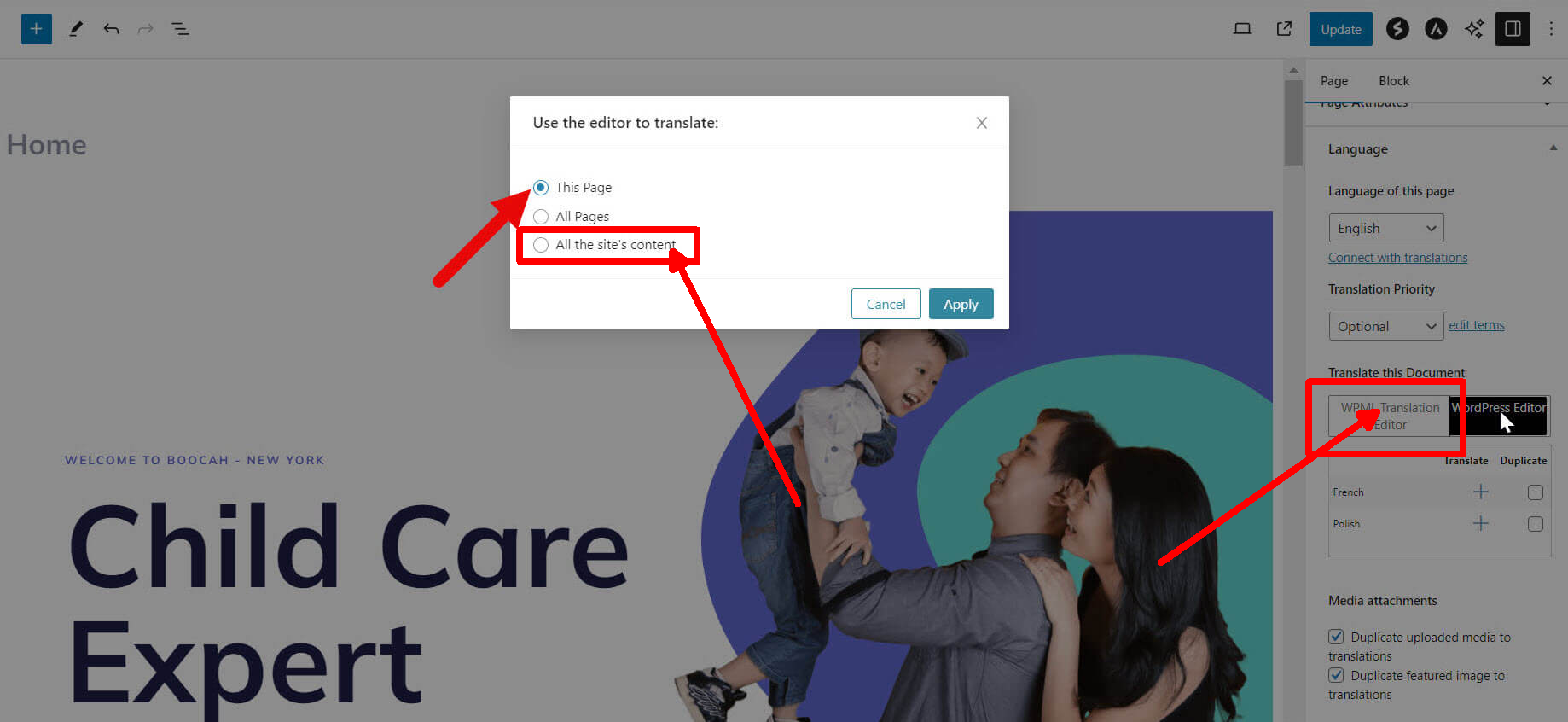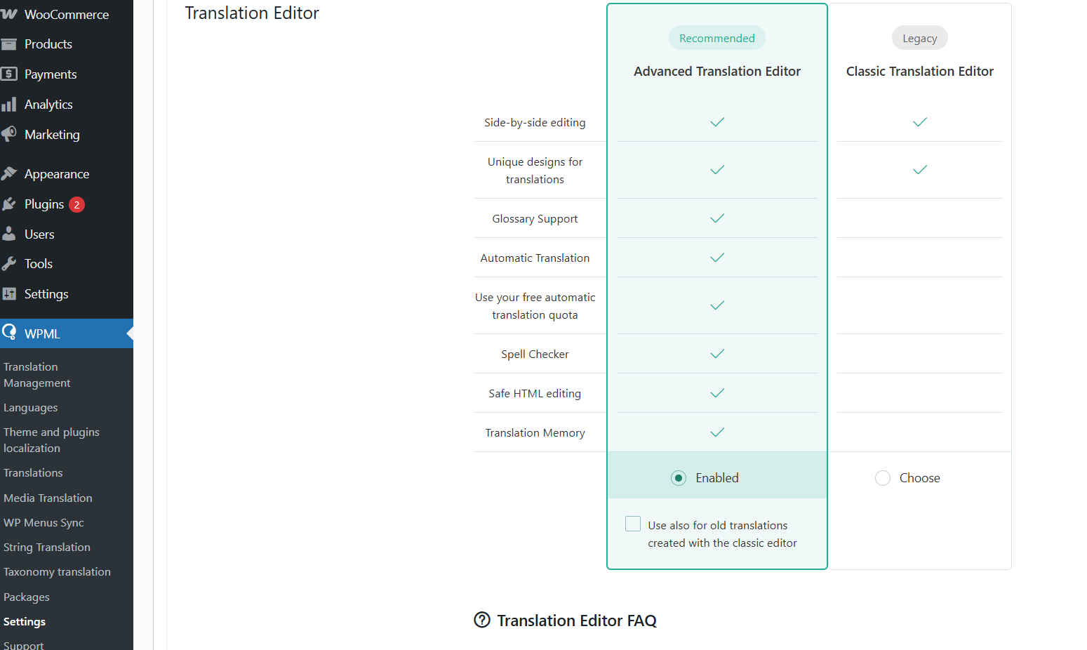 Si vous rencontrez ce problème, nous vous recommandons de vérifier si vous avez activé WPML Translation Editor comme votre éditeur par défaut. Vous pouvez trouver les instructions pour configurer cela dans notre documentation : Comment utiliser différents modèles pour différentes langues.