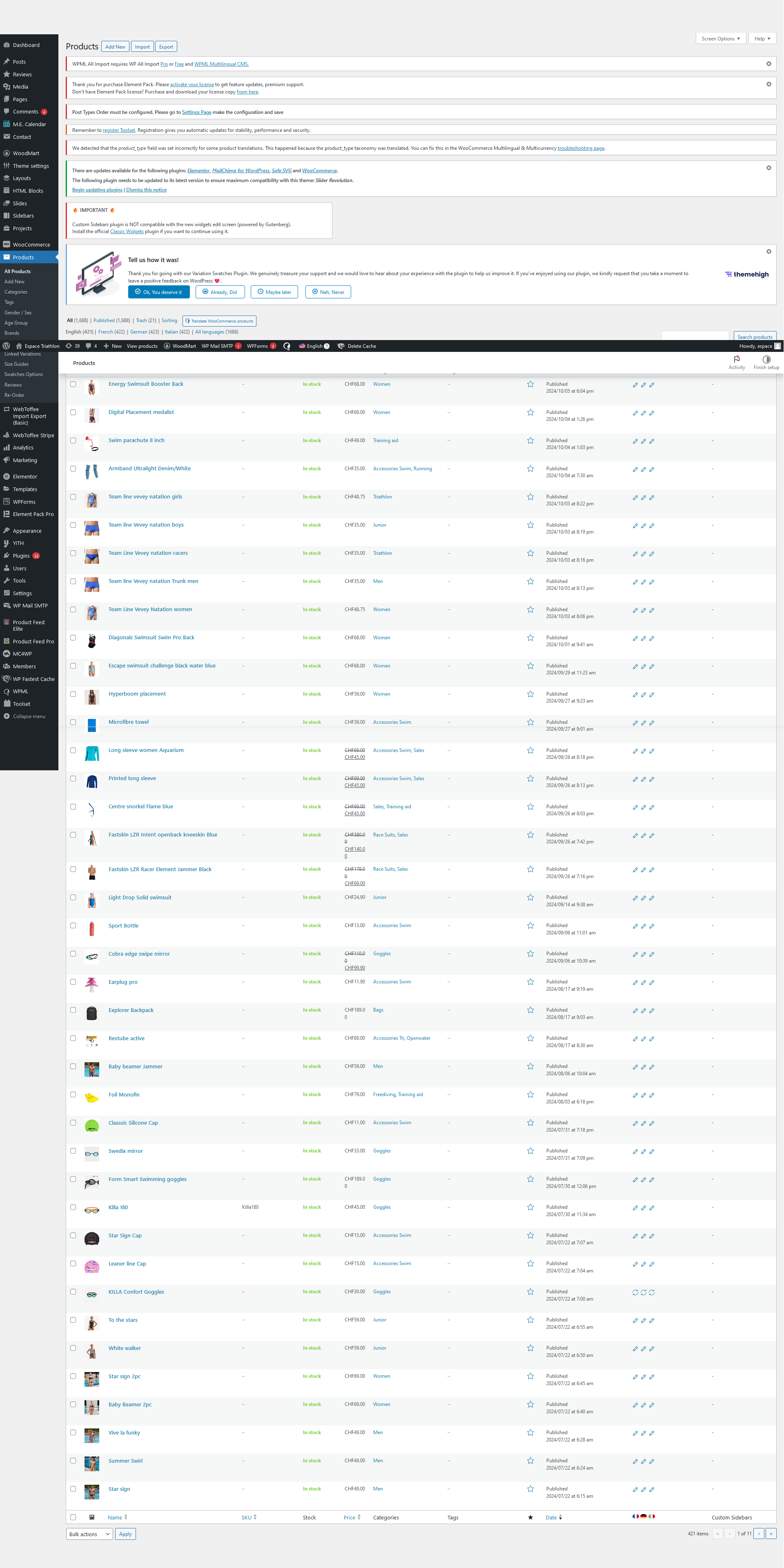 | philippew-7 | Thank you for the suggestion. Yes opening the translation and updating it helps. The price appear However, this is not the case when the price does not appear in the English version. I create products in English, and when the product is created, the price doesn't always appear in the English version (whereas it does in the German, French or Italian version). Similarly, when I update existing products with quantities or other information, the price disappears in the English version. To make it appear again, I have to open the product in English, modify the variations, save the variations again and update again. It seems to me that this is a rather lengthy procedure. Isn't there a bug? |