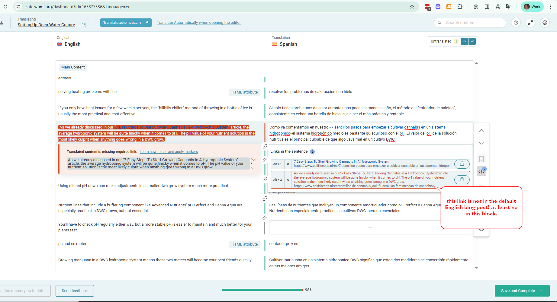 I am trying to solve a link problem in the Spanish language. However, the original English link is not on the default block, which must be translated. The whole block is marked as a link in Spanish. Here are the links to the pages where the issue can be seen: lien caché and lien caché.
