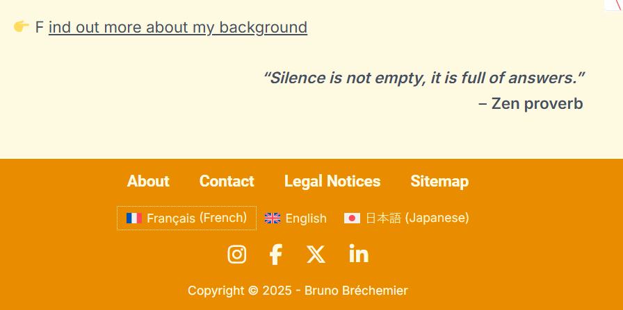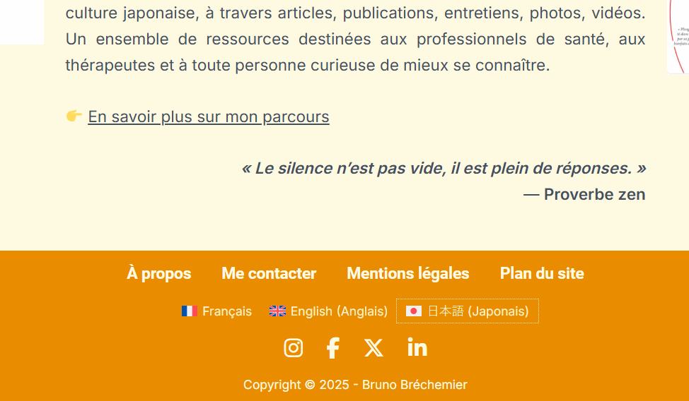 Pour en avoir le cœur net, j'ai désactivé le snippet PHP qui génère le pied de page. Puis j'ai réactivé le layout pied de page créé dans le Site Builder d'Astra, et qui posait un problème de traduction des items de menu dans le bloc navigation. Et là il semble qu'effectivement les items du menu sont traduits correctement au passage du français à l'anglais, et vice versa. Mais en ce qui concerne la traduction en japonais, je ne peux pas me prononcer puisque dans ce cas le pied de page disparait ! Avant d'effectuer des recherches et des manipulations je voudrais savoir si c'est vous qui pourriez être à l'origine de la disparition du pied de page dans la page en japonais ?