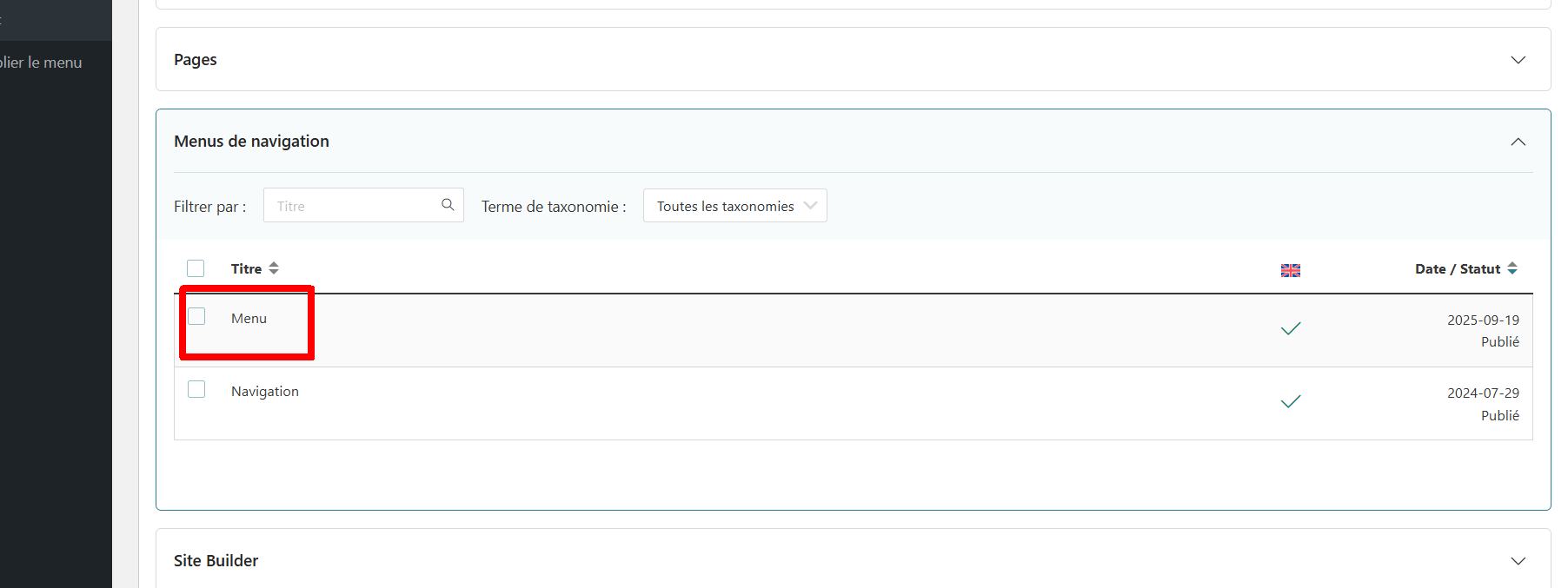 C’est ainsi que fonctionnent actuellement les menus Gutenberg lorsqu’ils sont intégrés dans des pages ou des modèles. En pratique, cela signifie qu’il faut effectuer deux étapes : il faut traduire le modèle du pied de page via le tableau de bord de traduction, et il faut aussi traduire le menu séparément, même s’il apparaît déjà dans le pied de page. Le menu ne s’affiche pas automatiquement dans l’éditeur de traduction du pied de page.