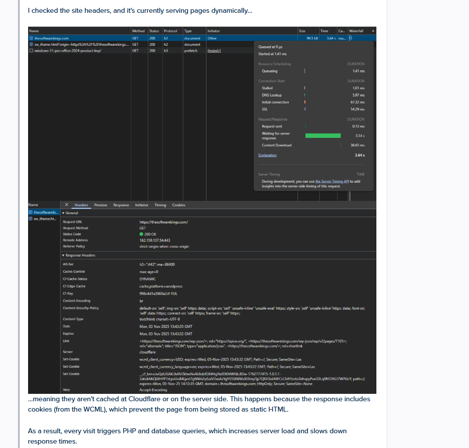 I am trying to improve LCP and general site speed due to failed URL metrics on Core Web Vitals. The site headers are currently serving pages dynamically and aren't cached at Cloudflare or on the server side. This happens because the response includes cookies from the WCML, which prevent the page from being stored as static HTML. Link to a page where the issue can be seen: lien caché