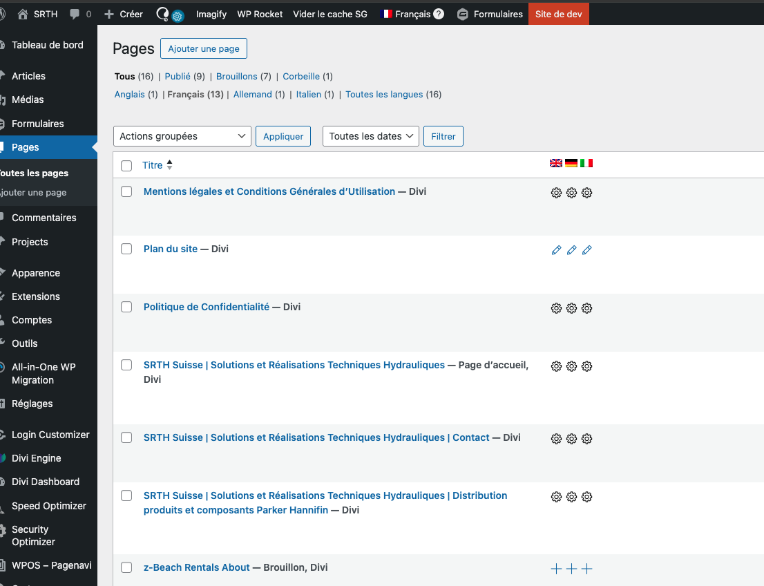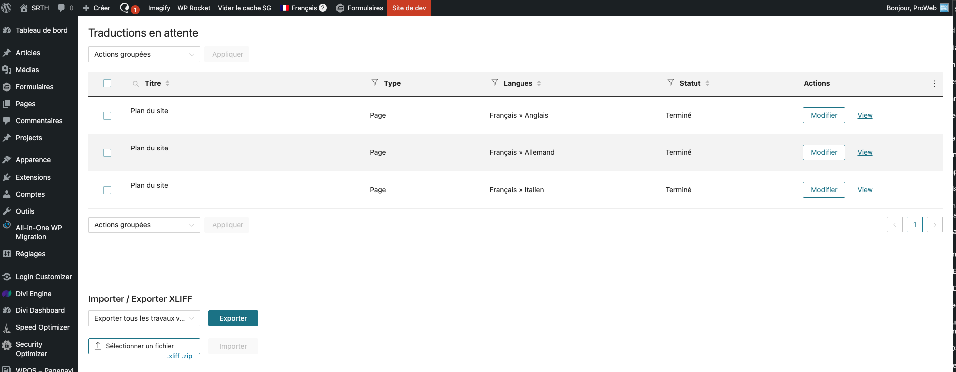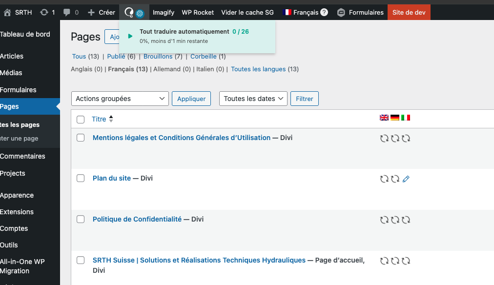 La traduction des pages tourne (cf image 1) pendant un moment avant de se figer (image 4). La tableau de bord de traduction annonce 26 traductions en attente (image 3), mais il n'y en a que 3 dans les traductions en attente (image 2).$