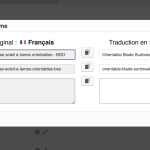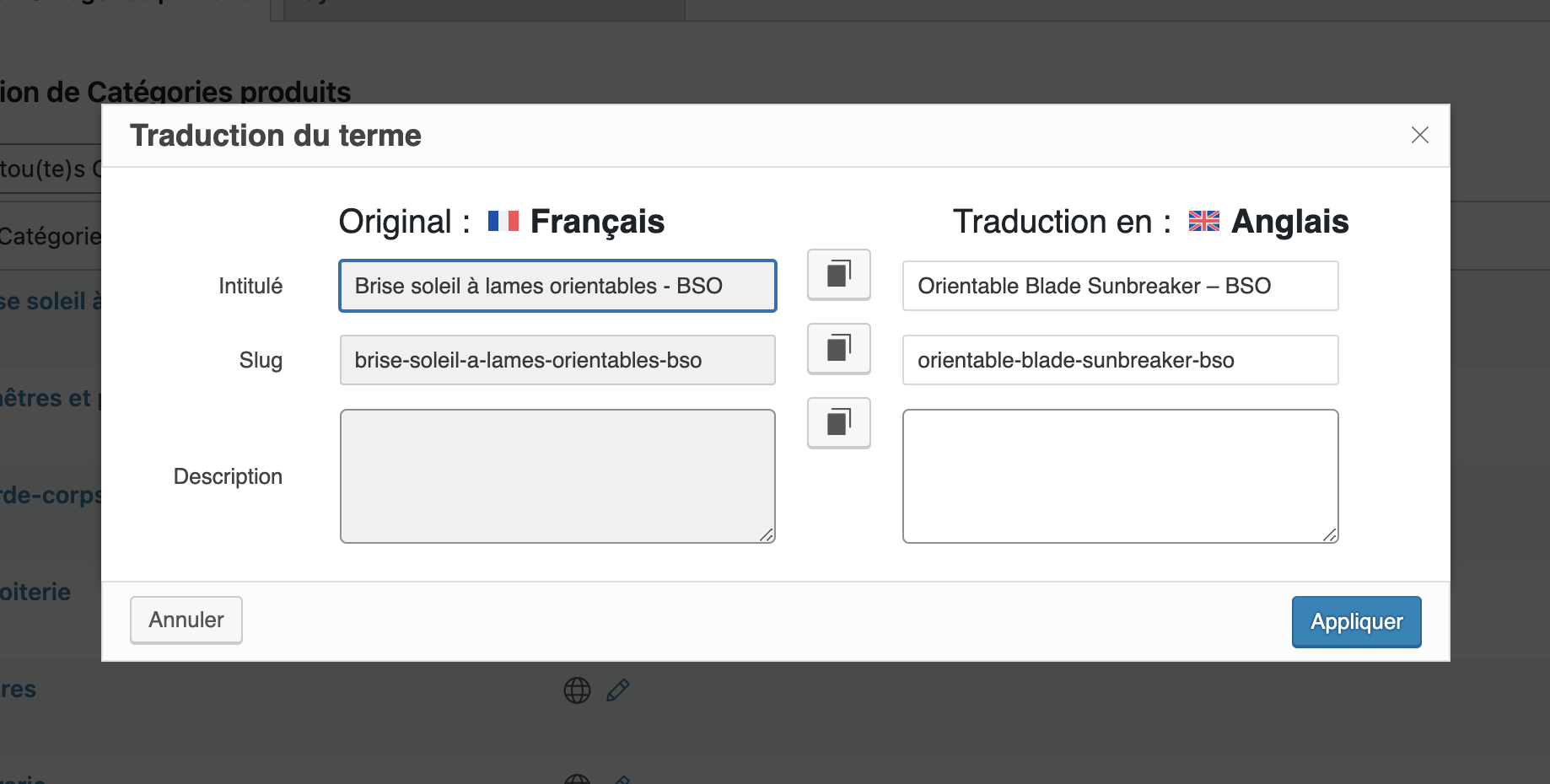Impossible d'avoir ces éléments à traduire automatiquement. Je dois aller manuellement dans chaque catégorie produit, puis sur la catégorie et mettre en anglais, aller sur l'élément et ajouter le texte en anglais et rajouter la photo manuellement.