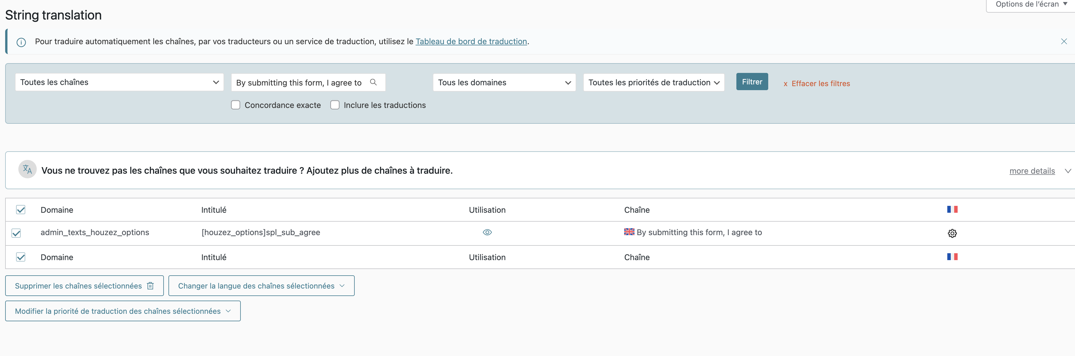 . Une fois là, configurez la langue d'origine (le français) pour afficher les traductions appropriées pour chaque champ, par exemple, le champ "Name" doit être traduit par "Nom". Après cette configuration, vous pourrez trouver et traduire les chaînes en français via l'outil « String Translation » de WPML. Pour une aide visuelle, consultez cette vidéo qui montre toutes les étapes nécessaires : https://www.loom.com/share/bc86c795a7f9494b9cf194d1f79abbf0.