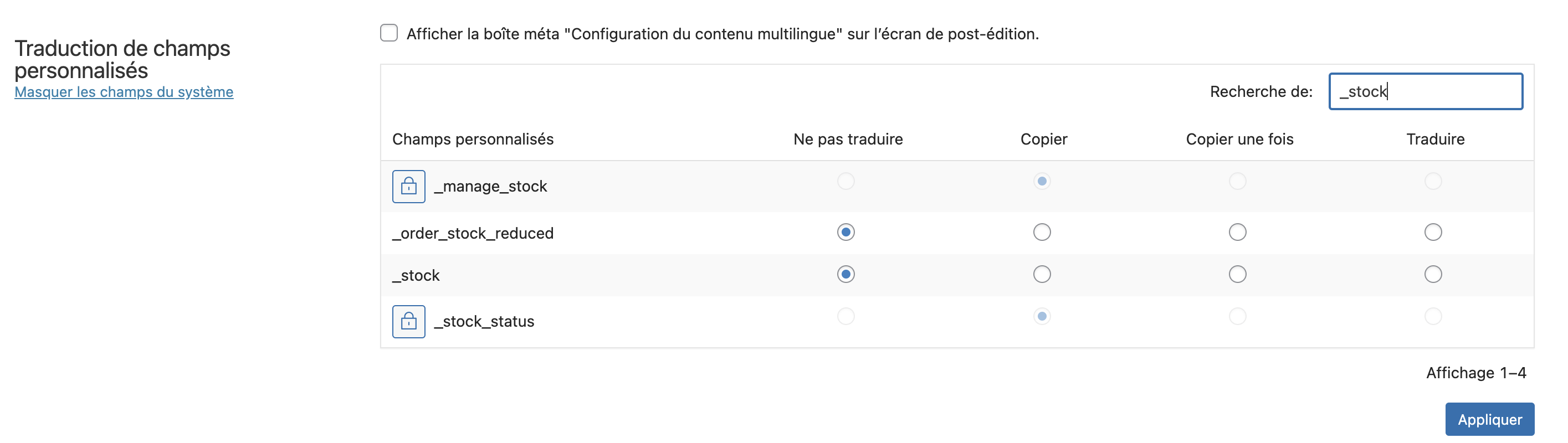 I am working on a site lien caché and using the WPML plugin along with WooCommerce. I have encountered an issue where new products created in the native language French don't show up in the English translated language because they seem to be out of stock. I have investigated and found that to resolve the issue, I need to force the field "_stock" to copy (instead of ignore) and disable a custom plugin of mine that gathers all WooCommerce related functions and styles. Before investigating what's wrong with my code, I need to understand why "_stock" is set to "ignore" and not "copy" by default. The screen capture does not show the lock anymore for _stock presumably because I have already tried to set the field to copy.