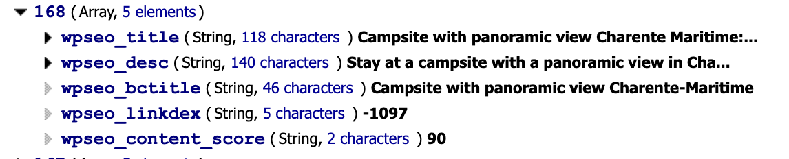 La catégorie française d’origine contenait une meta description en anglais stockée dans les métadonnées de taxonomie Yoast. Les termes traduits étaient correctement traduits et enregistrés, mais l’affichage en frontend ne correspondait pas aux valeurs en base de données en raison d’un décalage des indexables Yoast. (par example lien caché ou /en/quality/panoramic-view/) Nous avons vidé les tables wp_yoast_indexables et wp_yoast_indexable_hierarchy, puis lancé l’outil « Optimiser les données SEO » de Yoast. Après cela, l’affichage en frontend correspondait aux données en base, ce qui a confirmé que la catégorie française contenait bien une meta description en anglais. Nous avons ensuite mis à jour la meta description française et re-traduit le package de chaînes « Yoast SEO Term Meta ». Après ces actions, toutes les langues affichent désormais les bonnes meta descriptions. Nous vous invitons à vérifier les pages concernées. Nous vous recommandons également de contrôler que toutes les catégories françaises disposent bien d’une meta description en français, puis de re-traduire les chaînes « Yoast SEO Term Meta » après toute modification. À noter que le plugin Yoast Test Helper lien caché ne permet plus de réindexer les indexables depuis l’interface d’administration (hors WP-CLI); une réinitialisation manuelle des tables est nécessaire pour forcer leur régénération. |