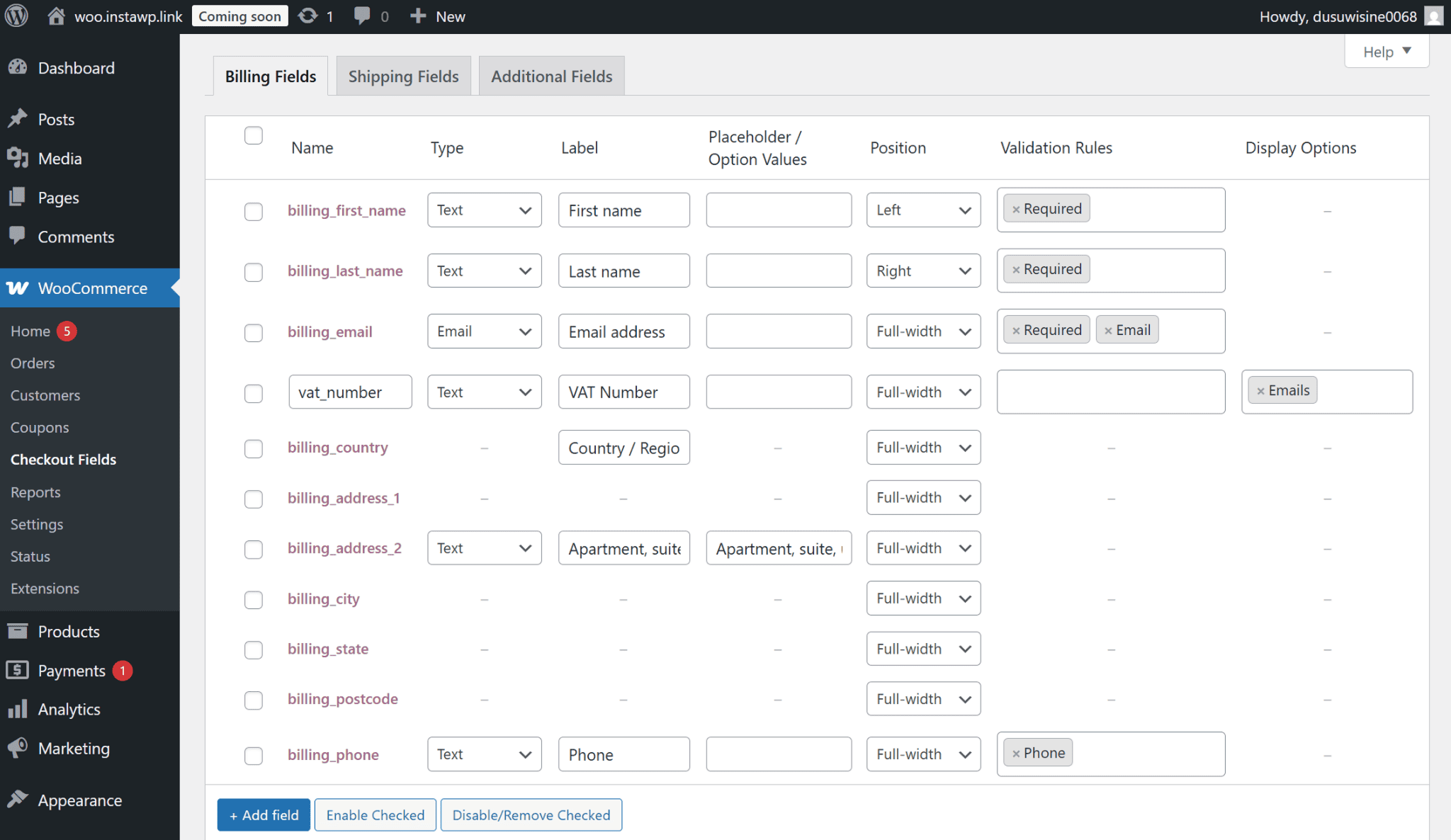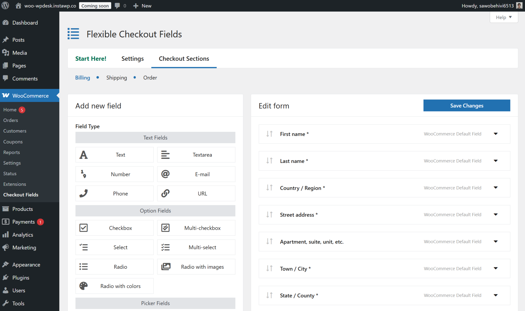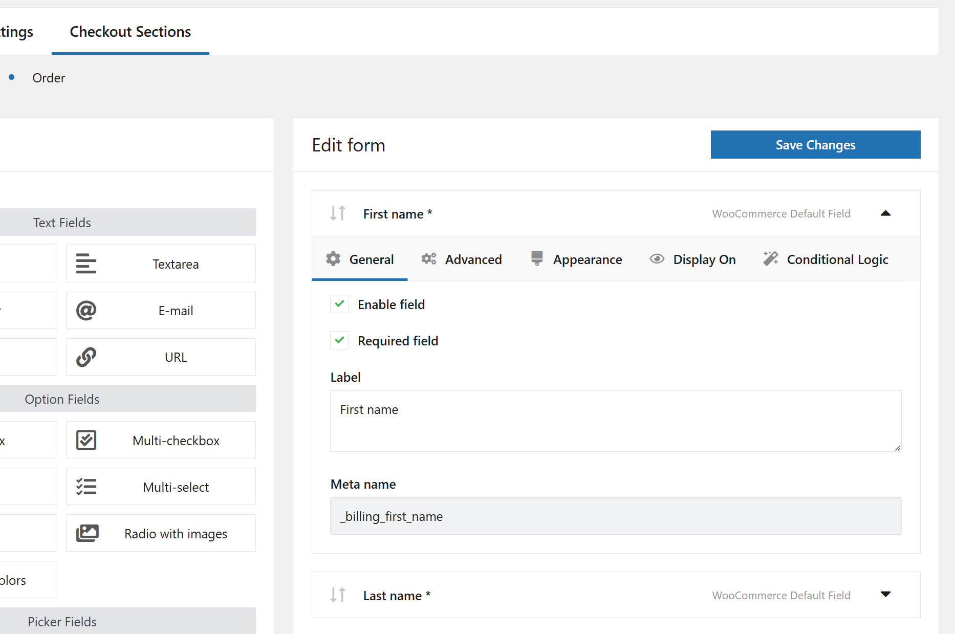 WooCommerce's own checkout field editor is built for stores that need to collect additional information at checkout – not reconfigure what's already there. Unlike other plugins in this roundup, it doesn't let you hide or remove the default WooCommerce fields, and can only add new ones. The editor itself is clean and straightforward — a single screen with drag-and-drop reordering and half/full-width field positioning. The trade-offs are significant though: there's no free version, and it only works with Classic Checkout.