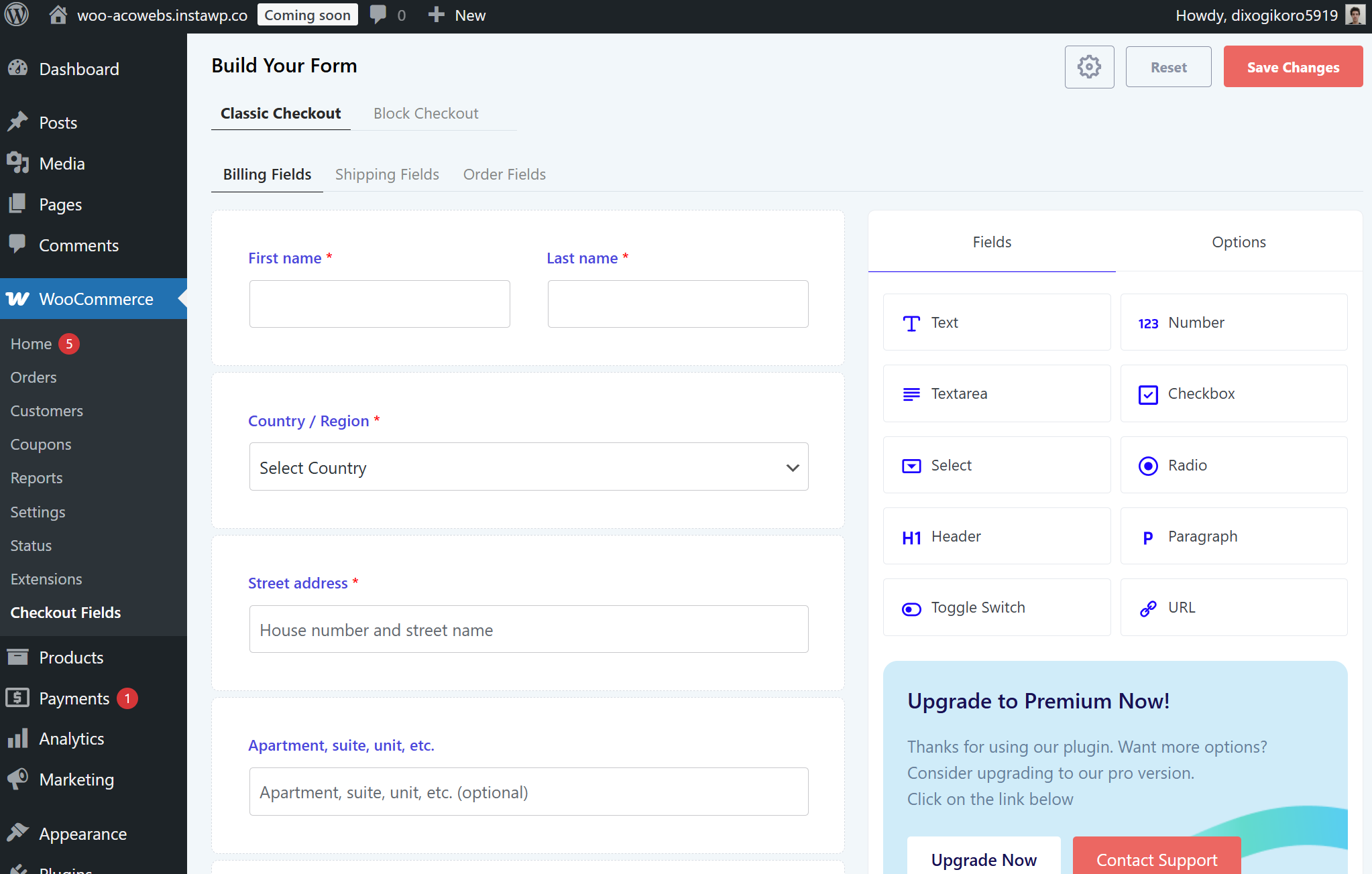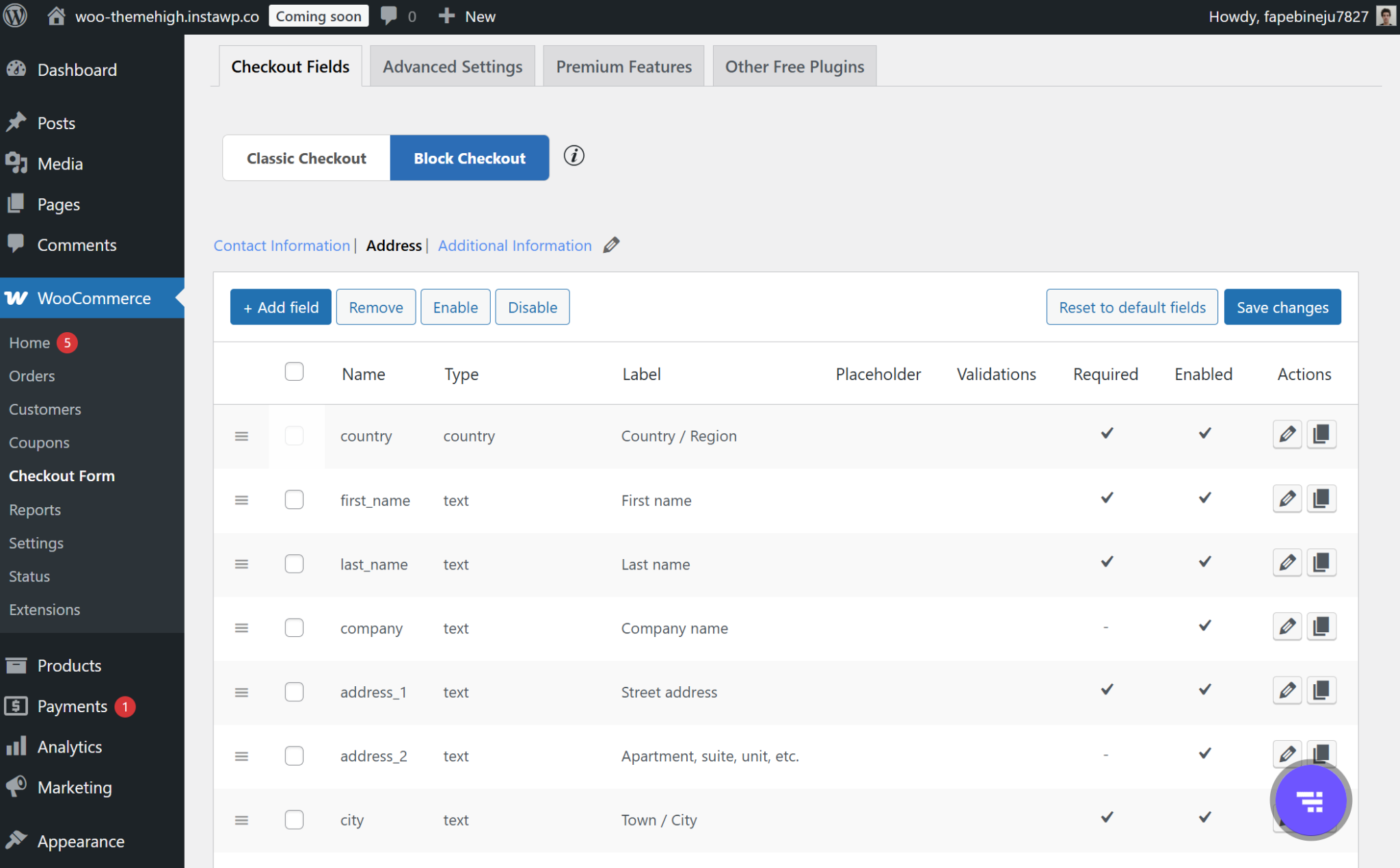 Checkout Field Editor and Manager for WooCommerce stands out in this roundup for having the most intuitive editor interface — a drag-and-drop builder . Unlike the table-based editors most competitors use, the layout makes it immediately clear what your checkout will look like as you build it. With 10 free fields and support for both Classic Checkout and WooCommerce Blocks, it covers most stores' needs straight out of the box. That being said, you'll need the plugin's paid plan to enjoy WPML compatibility.