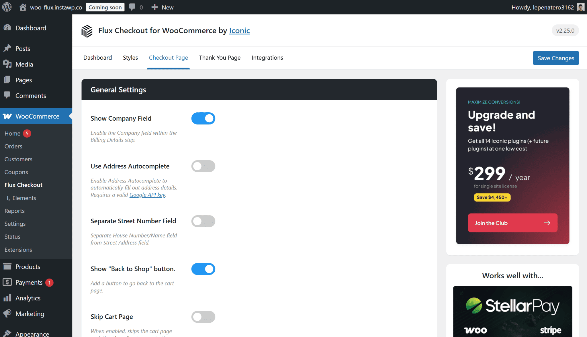 Flux Checkout for WooCommerce takes a different approach to checkout customization – it doesn't let you add, remove, or reorder individual fields at all. Instead, it offers preset checkout templates tailored to different store types: physical products, digital products, company orders, and more. Each preset shows only the fields relevant to that context, which makes for a cleaner checkout without any manual configuration. It works with both Classic Checkout and WooCommerce Blocks, and is compatible with WPML. On top of checkout configuration, the plugin also offers address autocomplete and cross-sell products during checkout.