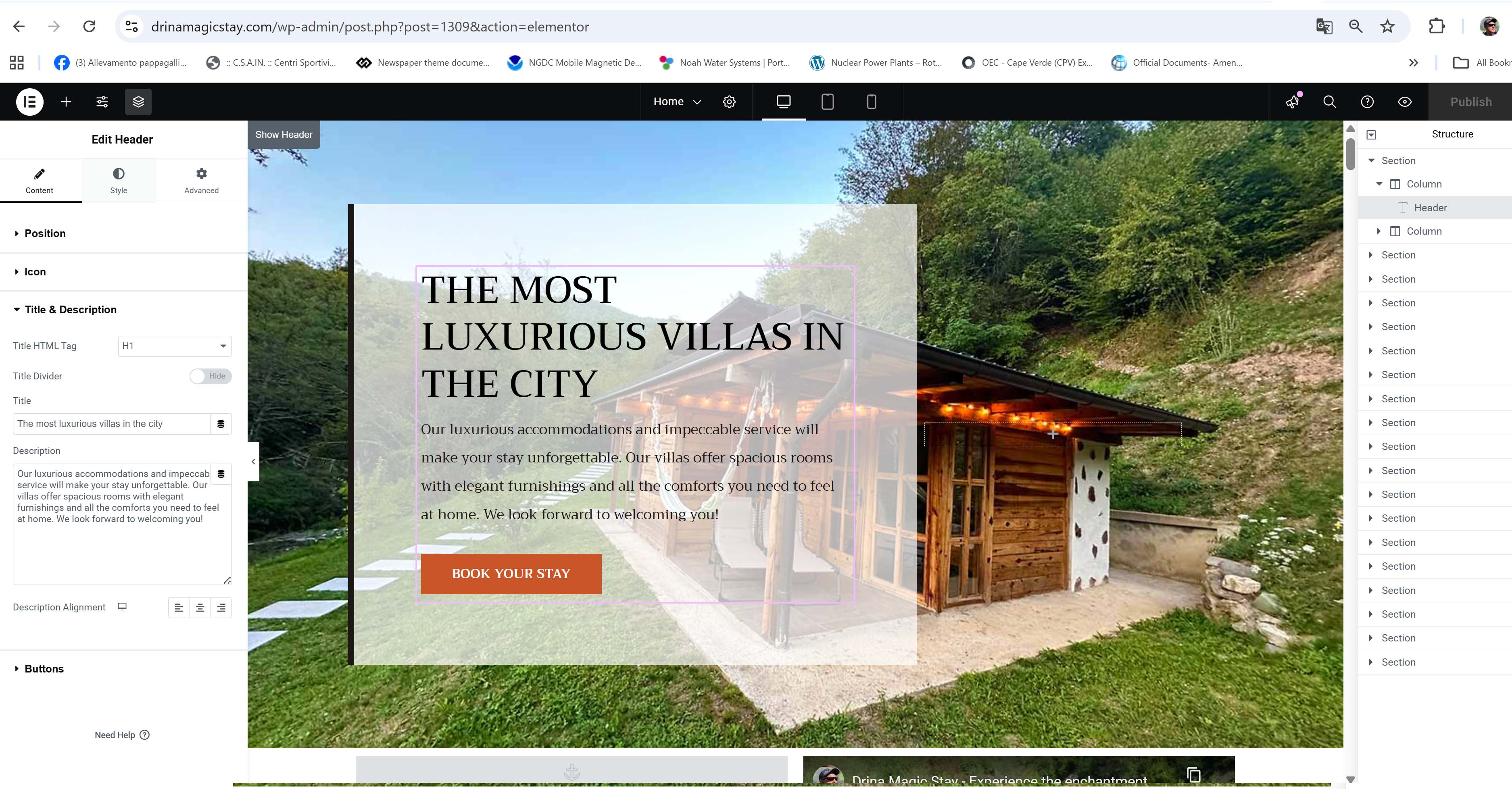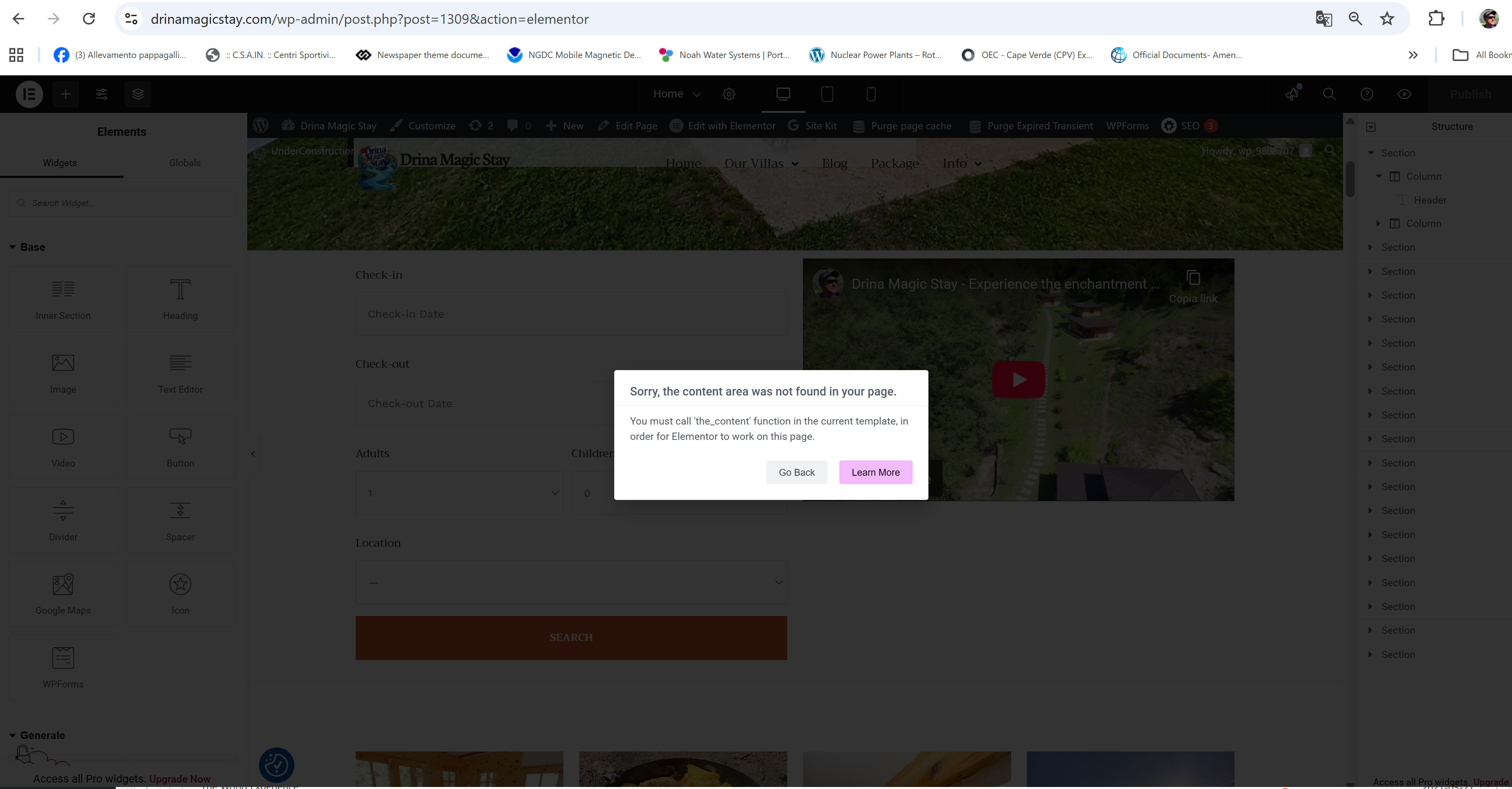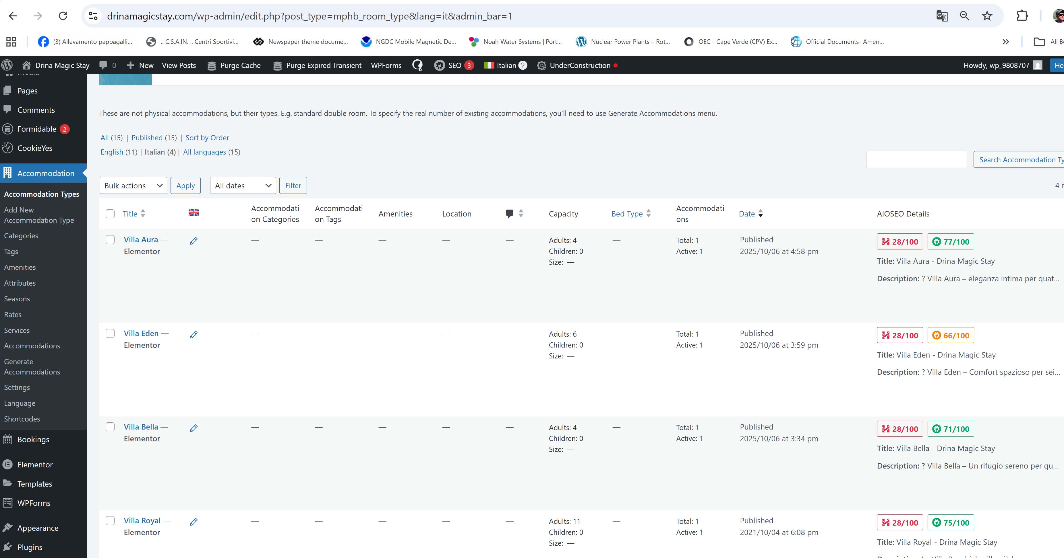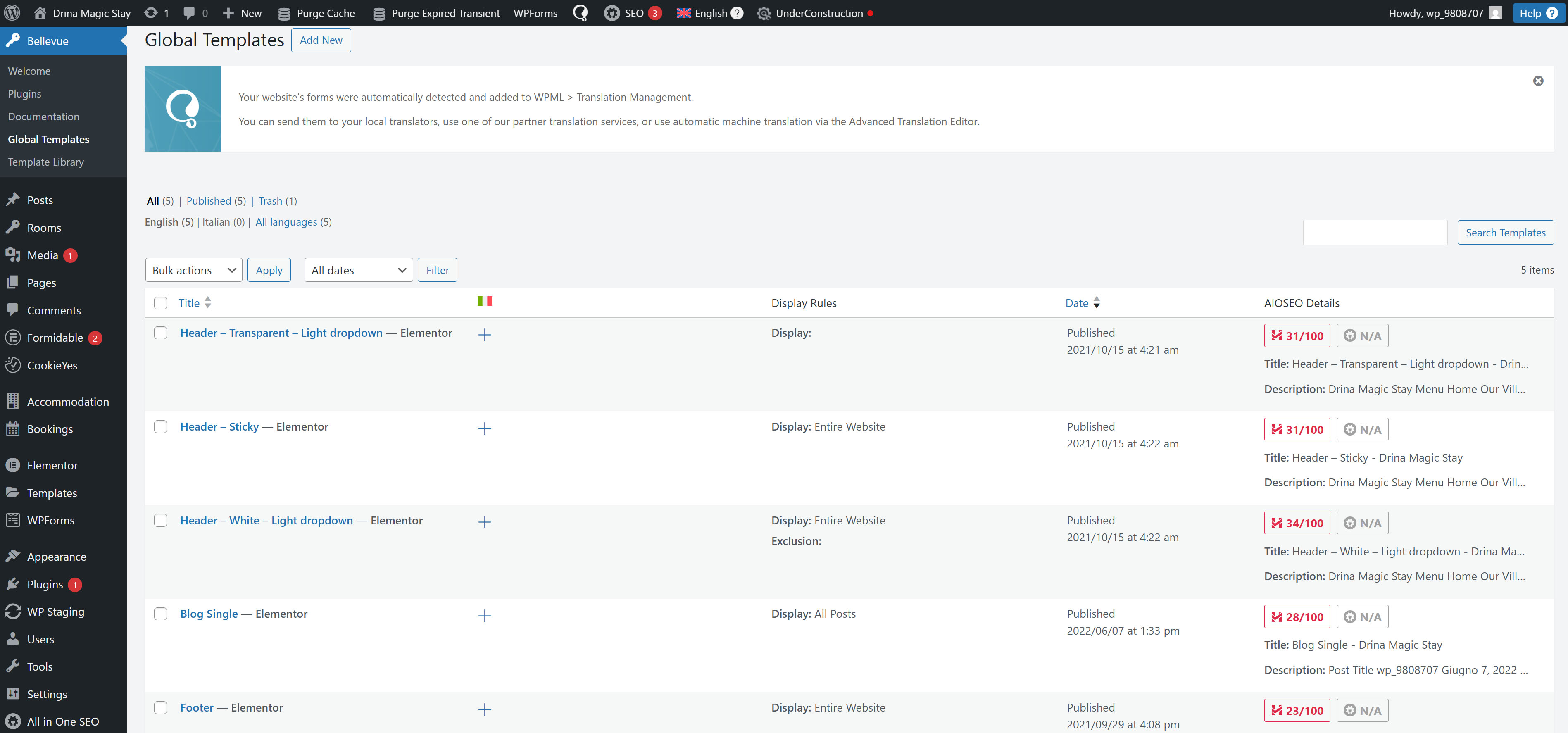 Prima di tutto grazie per il tuo aiuto preziosissimo. Inotrerò tutte le tue domande ai creatori del tema. Una cosa te la posso dire , per aggiungere il logo bisogna aprire ogni singola pagina esistente in ... BELLEVUE ... GLOBAL TEMPLATE... e modificare ogni singolo file aggiungendo il logo...etc.... Ti allego la foto Lo home page è scritta in elementor e tutti i contenuti sono campi testo.... ad eccezione delle ville o post del blog che provengoo dalle Accomodation e Post. Ogni pagina usa delle configurazioni per ogni elemento .... Le Ville (Accomodation) hanno una serie di attributi e settaggi che si trovano all'interno di (ACCOMODATION -> poi tutti ....AMENITIES , ATTRIBUTES, SEASONS, RATES, SERVICE, CATEGORIES, TAGS, ACCOMODATION Ogni pagina ... che compone il sito se fatta in Elementor può avere contenuti di testo, che sono all'interno di elementor.... Adesso Vorrei procedere con la traduzione delle pagine necessarie e vedere se sunziona, ma mi devi dire se ho il credito necessario per farlo o lo vuoi fare te. Le PAGINE possono anche essere tradotte tutte, tanto richiamano i dati tramite widgets, per cui hanno pochissimi contenuti. Io posso anche farlo da solo.. ma preferirei una tua conferma.... Dimmi come procedere per i crediti che devo usare per tradurre... oppure se vuoi lo puoi fare anche te.... Grazie |