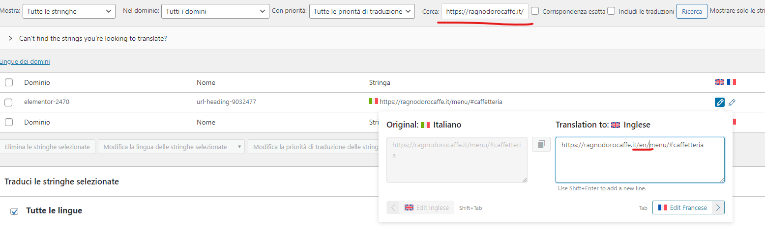 Grazie per l'accesso, ho potuto verificare e ho notato, controllando in WP-Admin-> WPML -> Traduzione stringhe, che i link non erano tradotti correttamente (si prega di controllare l'immagine allegata).