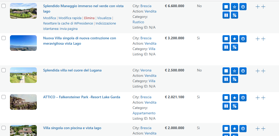 Grazie Paola Anzi mi risulta un altro problema che non so se dipende da WPML. Nell'elenco degli immobili l'ultima colonna i "+" dovrebbero indicare che manca la traduzione che invece c'è. Le traduzioni vengono importate con WP All Import. Non tutti sono così. Altri hanno la traduzione, cioè compare il simbolo di matita. Quella che vedi al centro da € 2.500.000 ha la traduzione in inglese e tedesco Grazie |