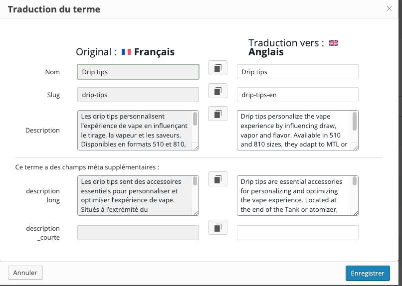 Contexte de la question: Je veux traduire les titres et les meta descriptions Yoast des catégories de produits sur mon site link nascosto.