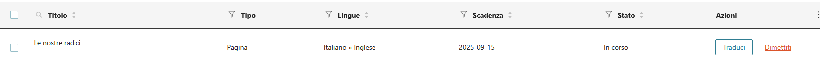 Ho creato un nuovo utente a cui ho assegnato le traduzioni e sono riuscito a gestire quasi tutte le traduzioni. Ho ancora problemi su una pagina che che contiene 3 parole, la assegno al traduttore, faccio delle modifiche, salvo e mi rimane la pagina con la traduzione in corso. |