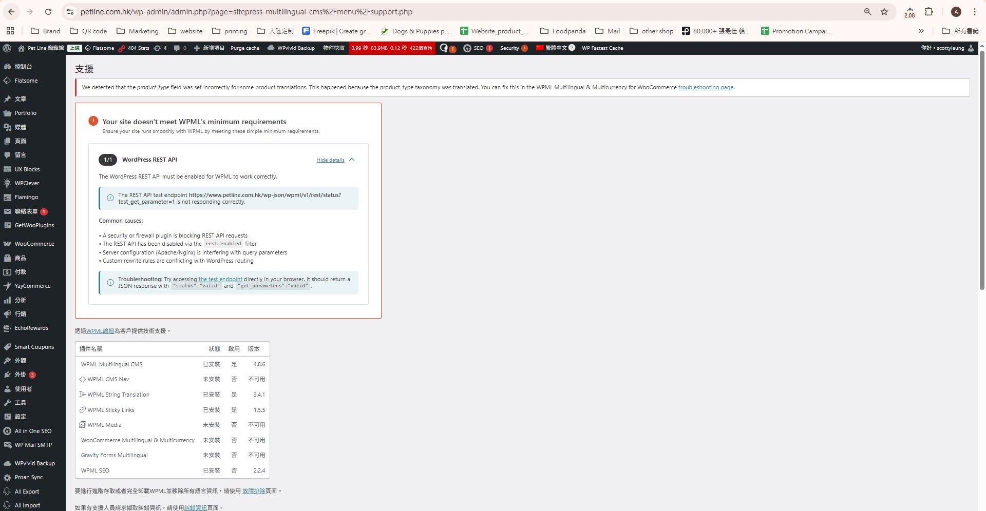 The REST API is clearly working, but WPML still displays the warning and refuses to clear it even after clearing all caches (WP Fastest Cache, Cloudflare Purge Everything, browser cache, WPML Troubleshooting > Clear cache).