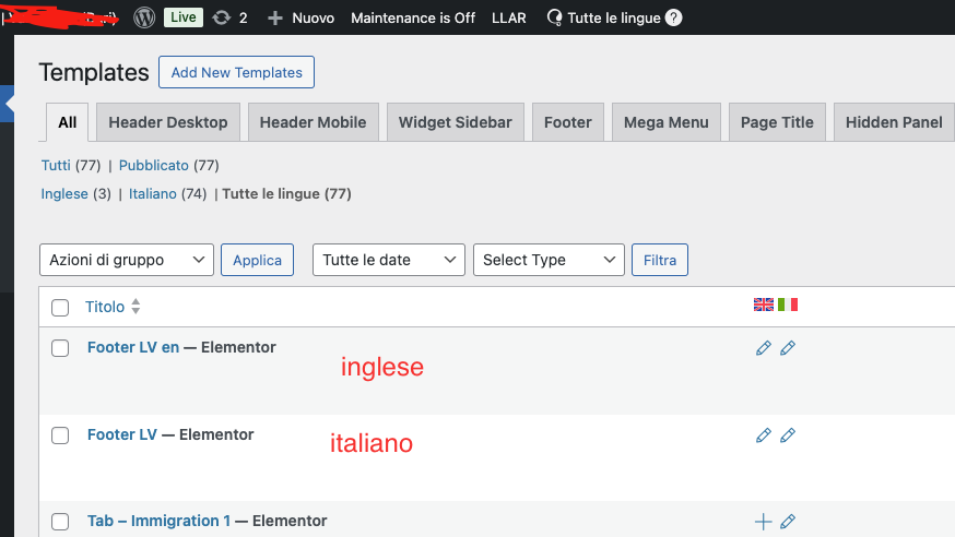 Pensando che il problema fosse il widget del produttore del tema che sto utilizzando, ho creato un elemento Pulsante nativo di Elementor, l'ho tradotto, ma nel frontend lo da sempre in italiano. Sembra come se WPML (o il wordpress non so) stia ignorando del tutto le pagine della sezione Templates. Che fare? 😢