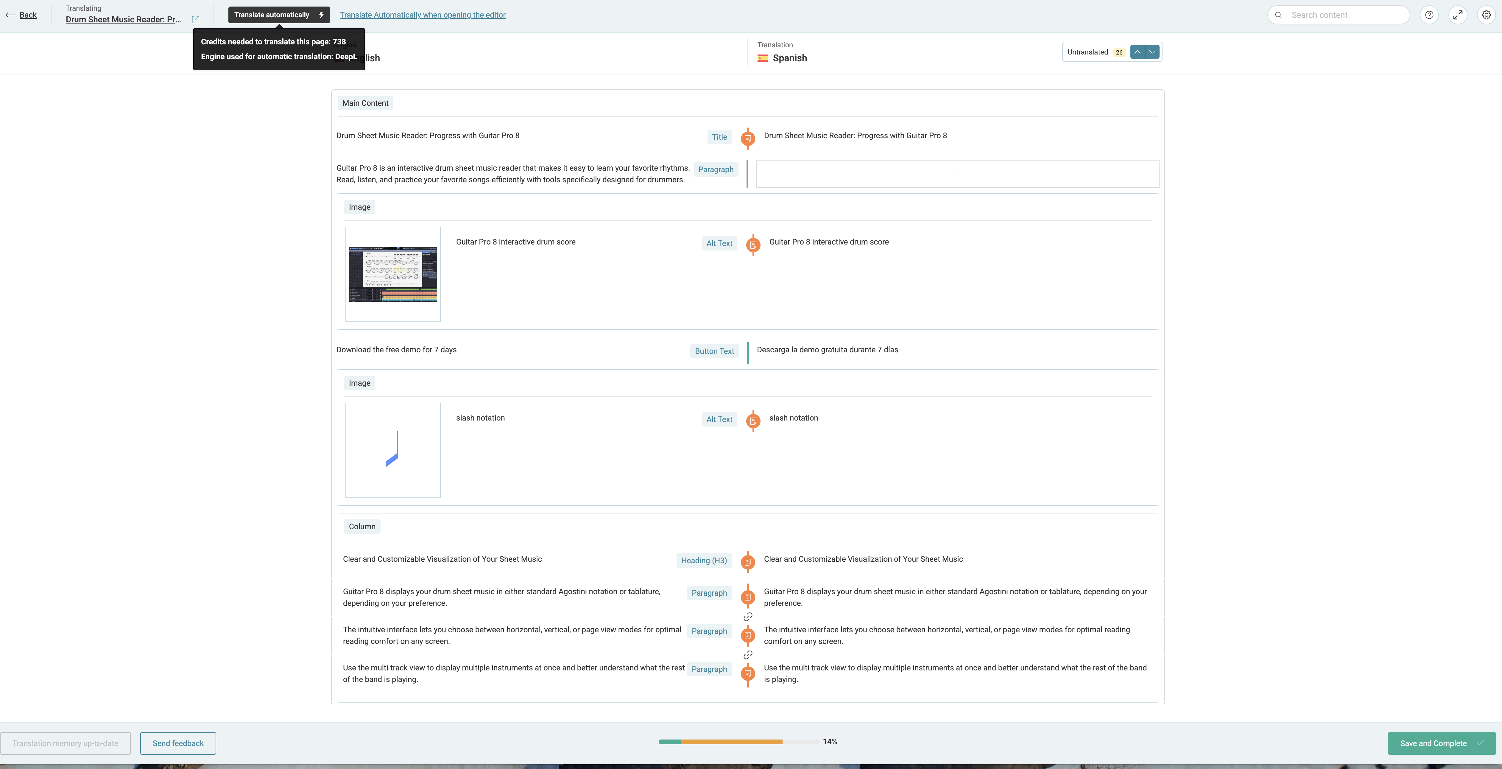 Lorsque je clique sur le bouton 'traduire automatiquement' dans la translation queue, rien ne se traduit et le bouton devient grisé. Si je réouvre la page, le bouton reste grisé. Cependant, la traduction fonctionne si j'utilise le picto 'éclair' pour traduire chaque paragraphe individuellement.
