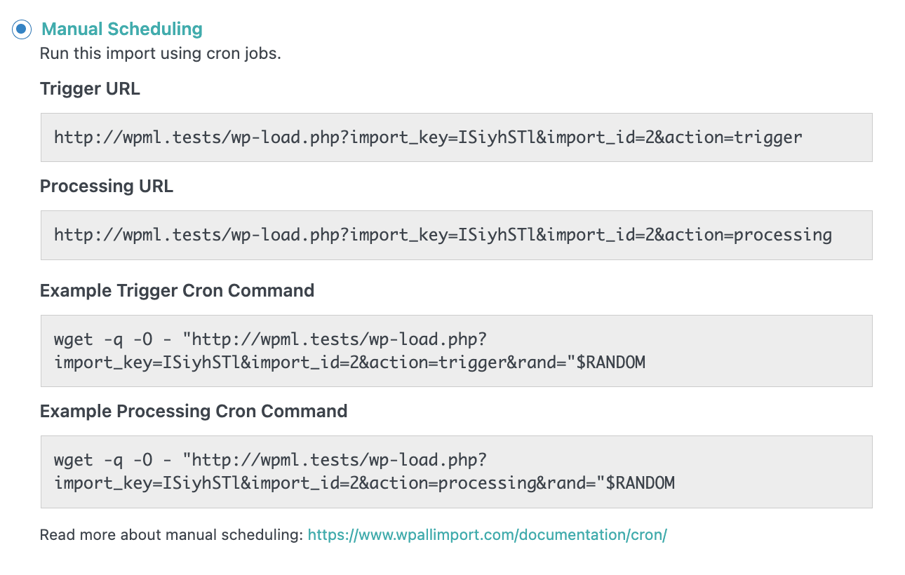 WP All Import Pro에서 수동 예약 구성을 사용한다고 가정해 보겠습니다. 설정은 다음과 같을 수 있습니다.