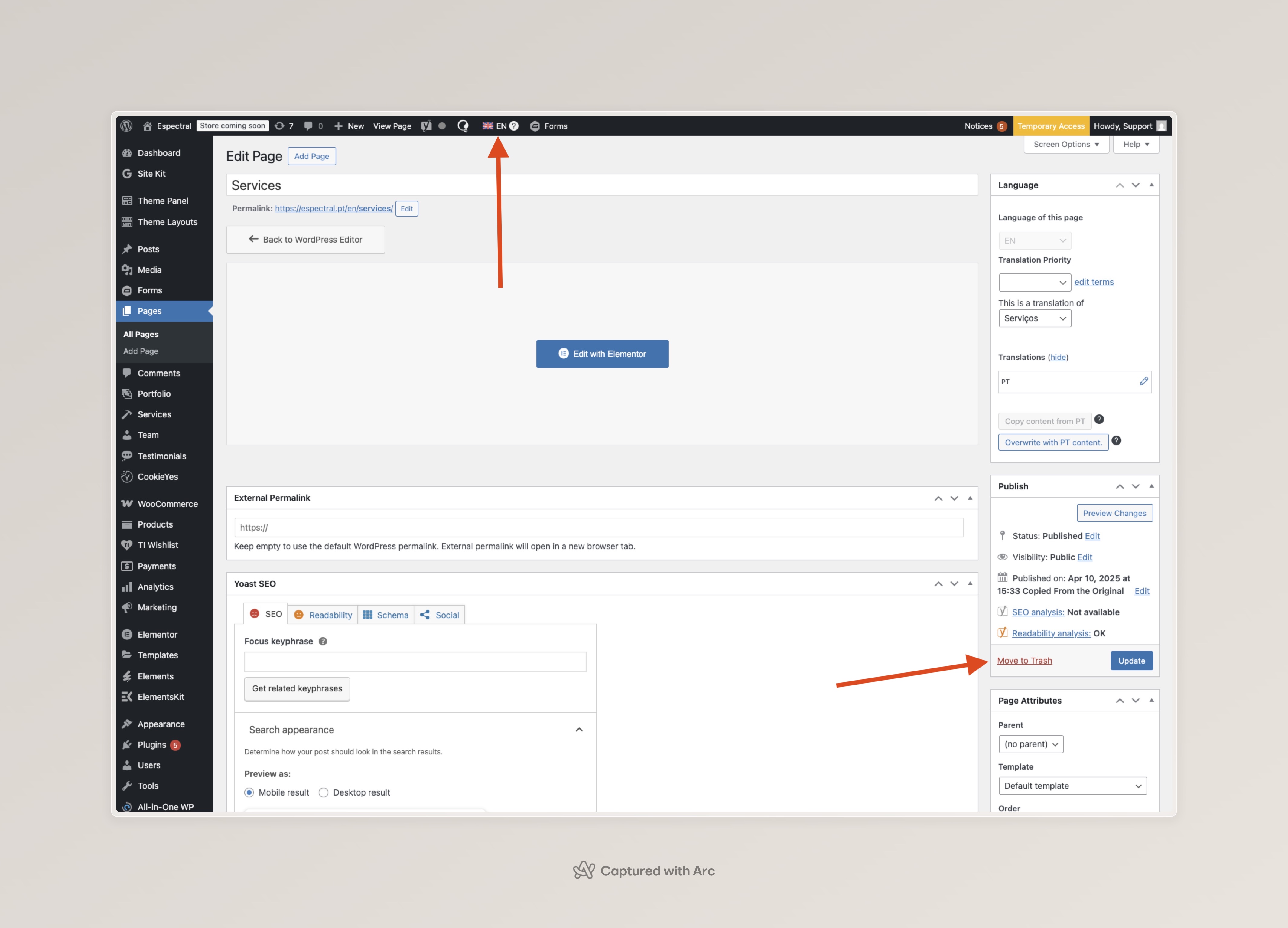 Obrigado pelo acesso. Em primeiro lugar, traduções que foram criadas usando o WPML Translation Editor, não devem ser editadas diretamente, usando o Elementor ou o editor de páginas do WordPress. Isso pode causar erros como o que você está tendo. Caso você deseje criar uma tradução usando o Elementor, você deve selecionar a opção “WordPress Editor” antes de criá-la. Confira os detalhes aqui: Como você está tendo problemas com a página de serviço, peço que faça um backup completo do site e siga estes passos: 1. Delete a tradução de serviços. Para isso, visite o WordPress editor da página de serviços, troque para o inglês na barra superior e clique em “Move to trash”. Confira na imagem 01. Agora, você pode traduzir a página sem problemas. Lembrando que, se deseja criar a tradução usando o Elementor, deve seguir os passos do link acima. |