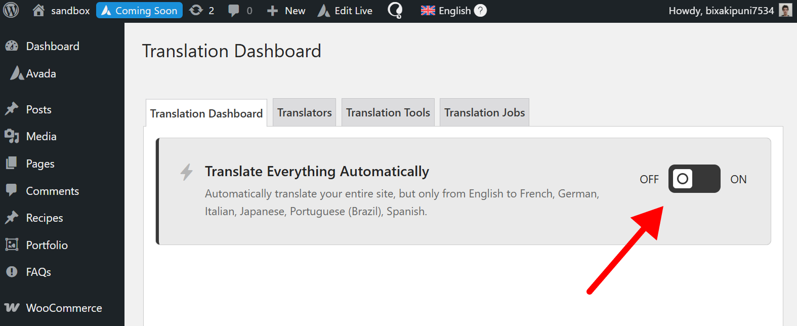 Para ativar o Traduzir tudo automaticamente, vá para WPML → Painel de Tradução e clique na chave na parte superior da tela.