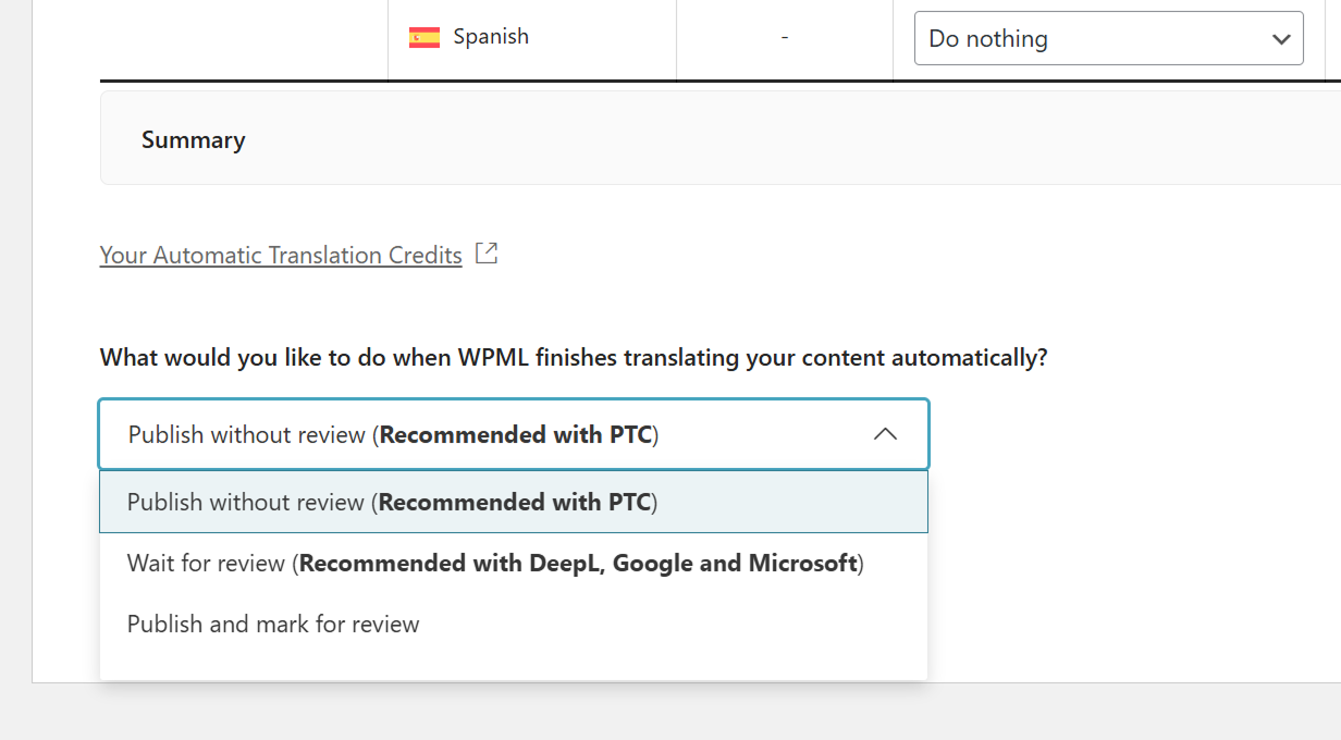 Em seguida, escolha seu método de tradução – para usar o PTC, selecione Traduzir automaticamente e certifique-se de que seu mecanismo esteja definido como PTC.