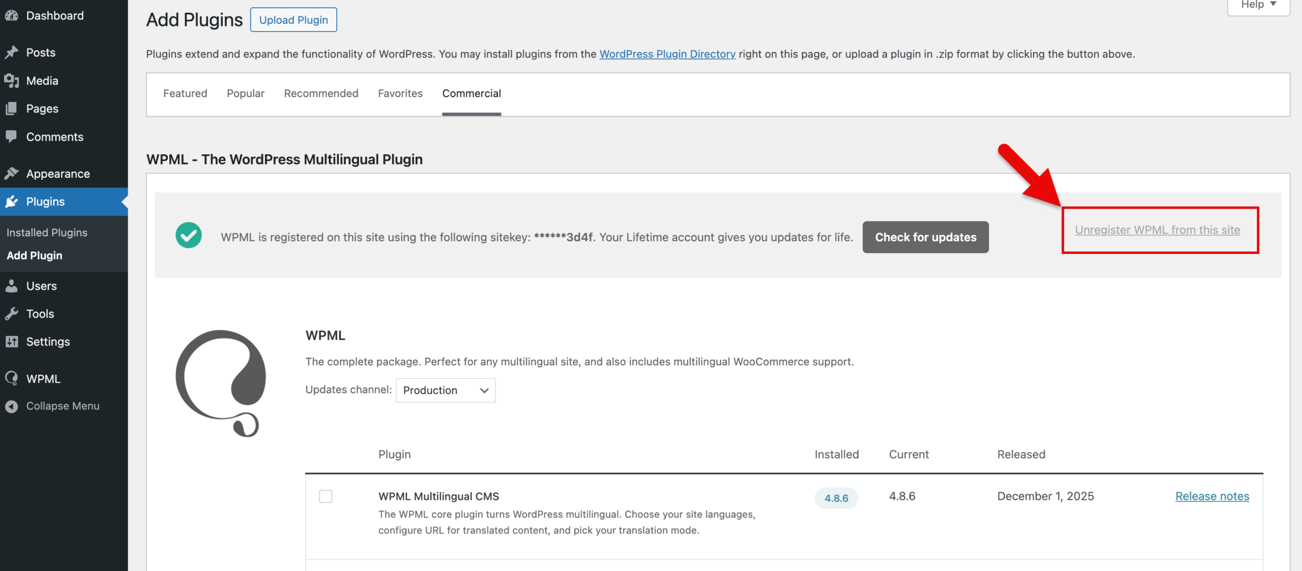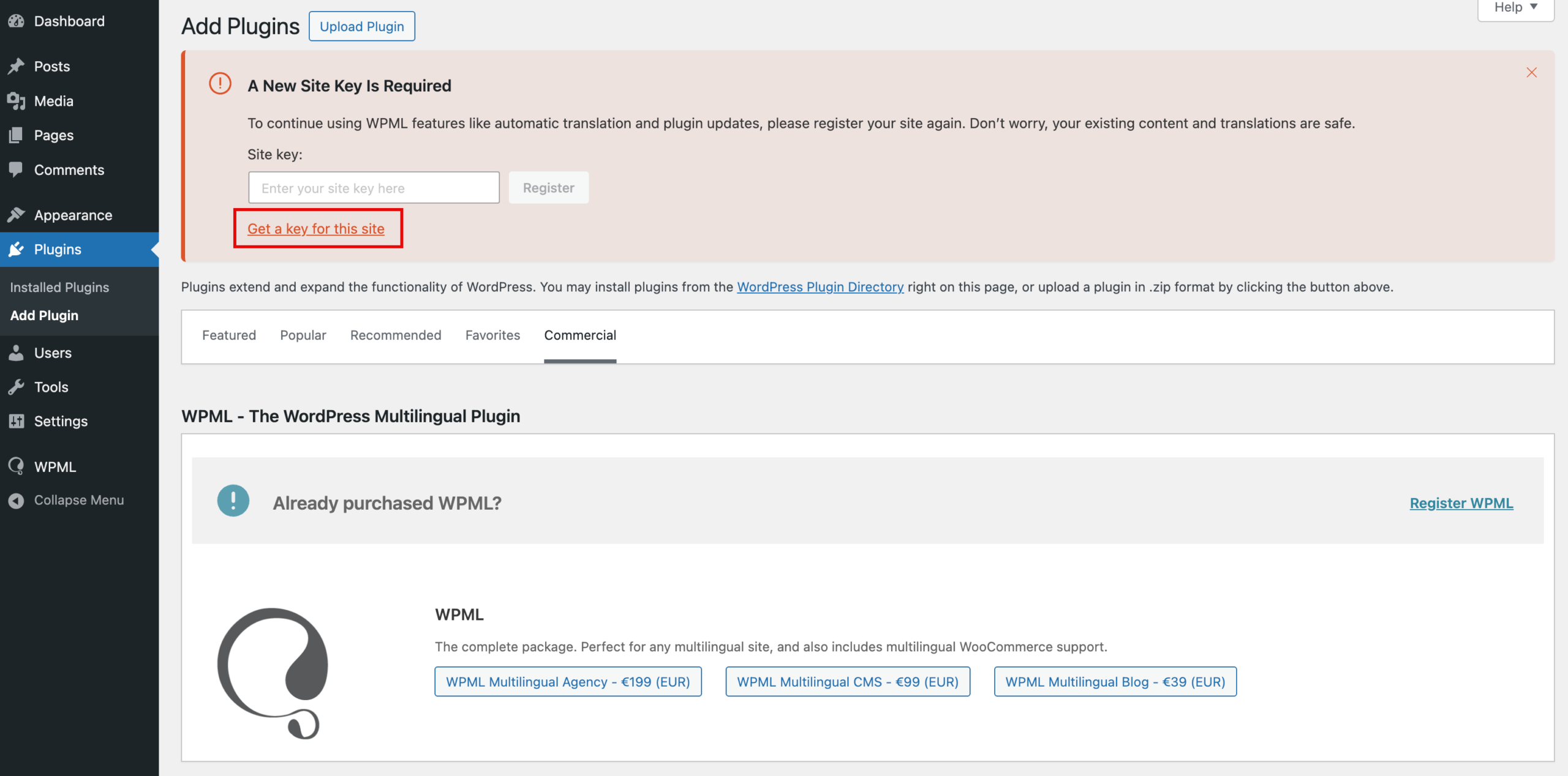 4. On the pop up, click on Get a key for this site to get a new registration code from your own account, and paste it in the field. WPML is now re-registered under your own WPML subscription.