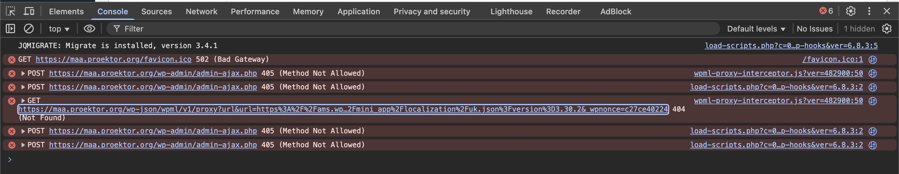 Everything works on the local server, but the error shown in the screenshot above occurs. On the actual website, /wp-admin/admin-ajax.php 405 (Method Not Allowed) appears in the console, but if you just go to the URL, everything works correctly. Similarly, if you disable wpml, the website works correctly.