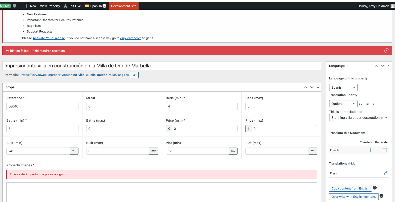 After translating and pressing update, I get two red bars on the page with the message: 'Validation failed. 1 field requires attention'.