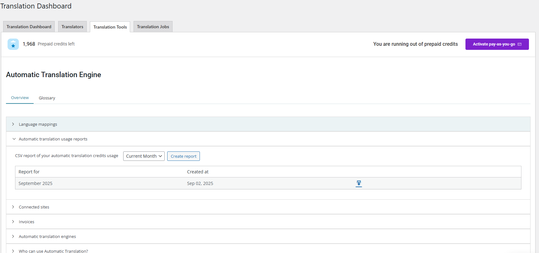 I am getting the 'You are running out of prepaid credits' message, even though I can see that I have 1,968 prepaid credits left. Instead of the translation being generated, I got an empty list asking me to manually add the translation.
