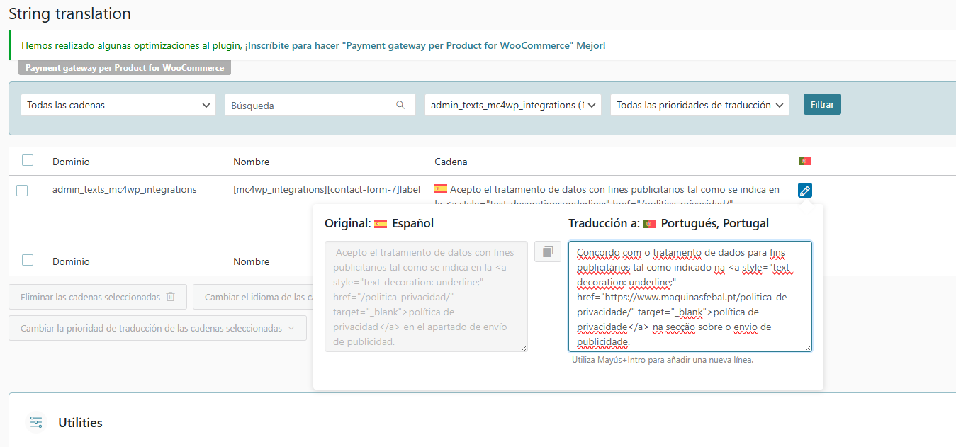 Estoy intentando traducir una cadena que forma parte de Mailchimp for Woocommerce, incrustada en un formulario de contacto en mi sitio web скрытая ссылка. La cadena está bien traducida al portugués.
