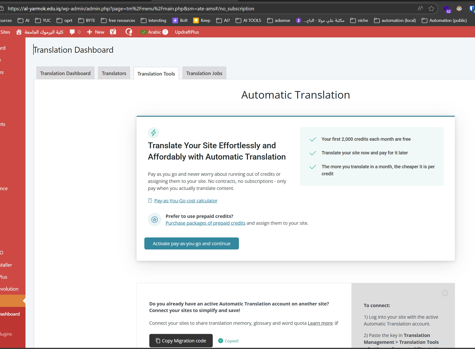 The subsite is automatically being treated as the main site, and the same options are visible on both al-yarmok.edu.iq and history.al-yarmok.edu.iq. The main site is only showing an option to copy the migration code.