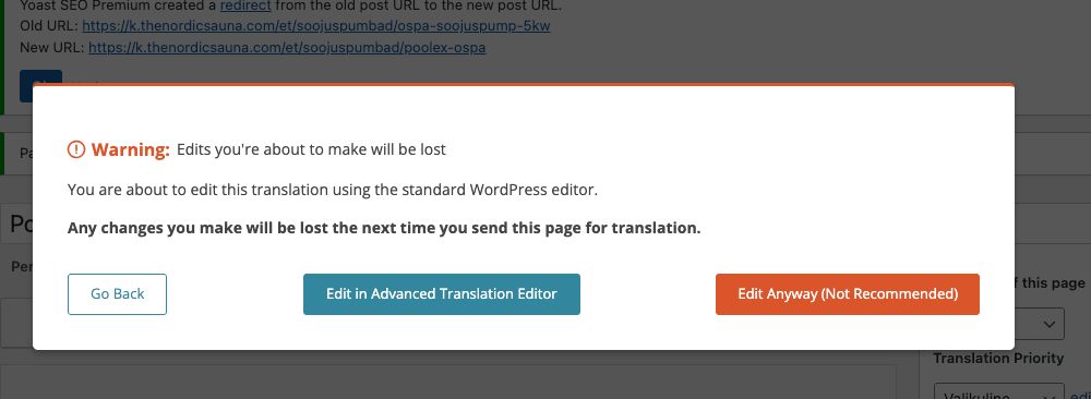 Can we safely change the slug of a translated page manually in WordPress (ignoring the warning that changes may be lost)?
