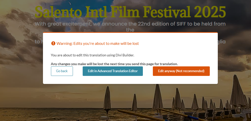I am trying to edit a page in English on my site 隐藏链接 using Divi Builder. I received a warning about potential loss of changes when editing a translation.