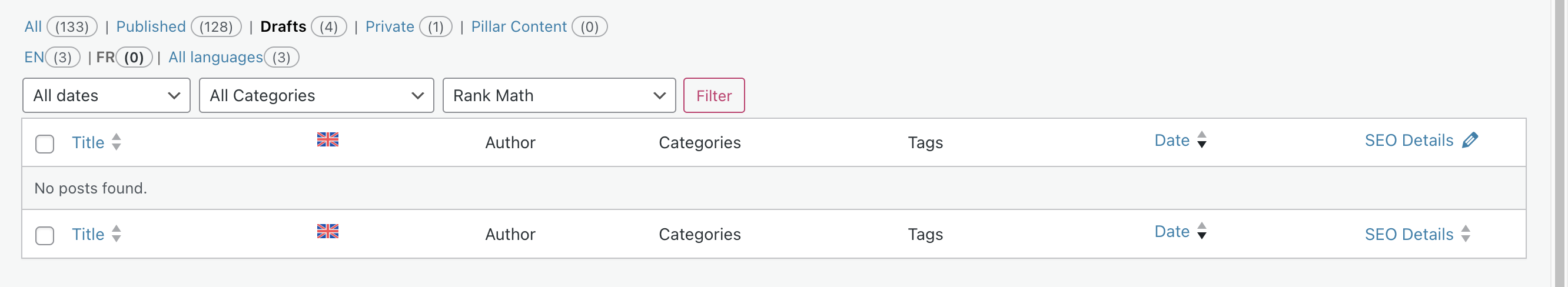 I am trying to update a blog post on the French version of my website. When I save it as a draft, it doesn't appear in the 'All Posts' section, although the draft count increases. Additionally, when I publish the updated French version, the text sometimes reverts to English, requiring me to update and publish it again.