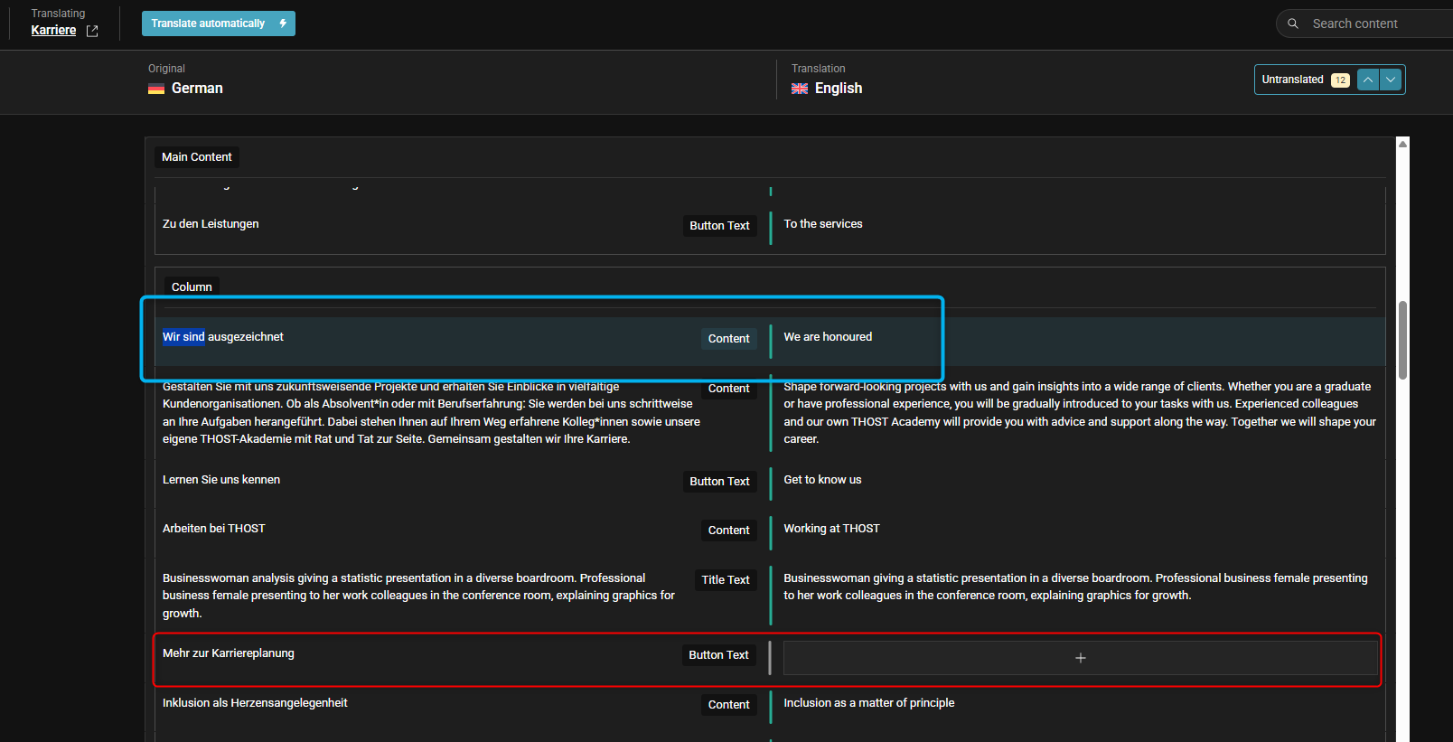 Zudem haben wir den Fall, dass bereits hinterlegte Übersetzungen nicht mehr vorhanden sind, wie hier im rot markierten Kasten.