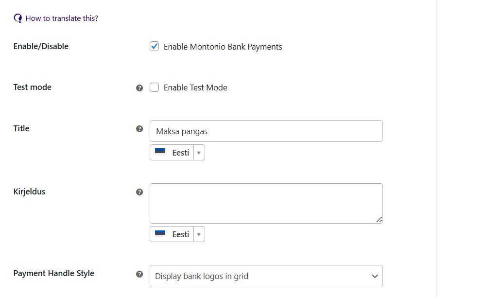 I am trying to use the Montonio payment plugin for WooCommerce on my WordPress site, which has two languages: Estonian (main) and Russian. I want the payment titles to remain in Estonian. The issue can be seen on this page: 隐藏链接.